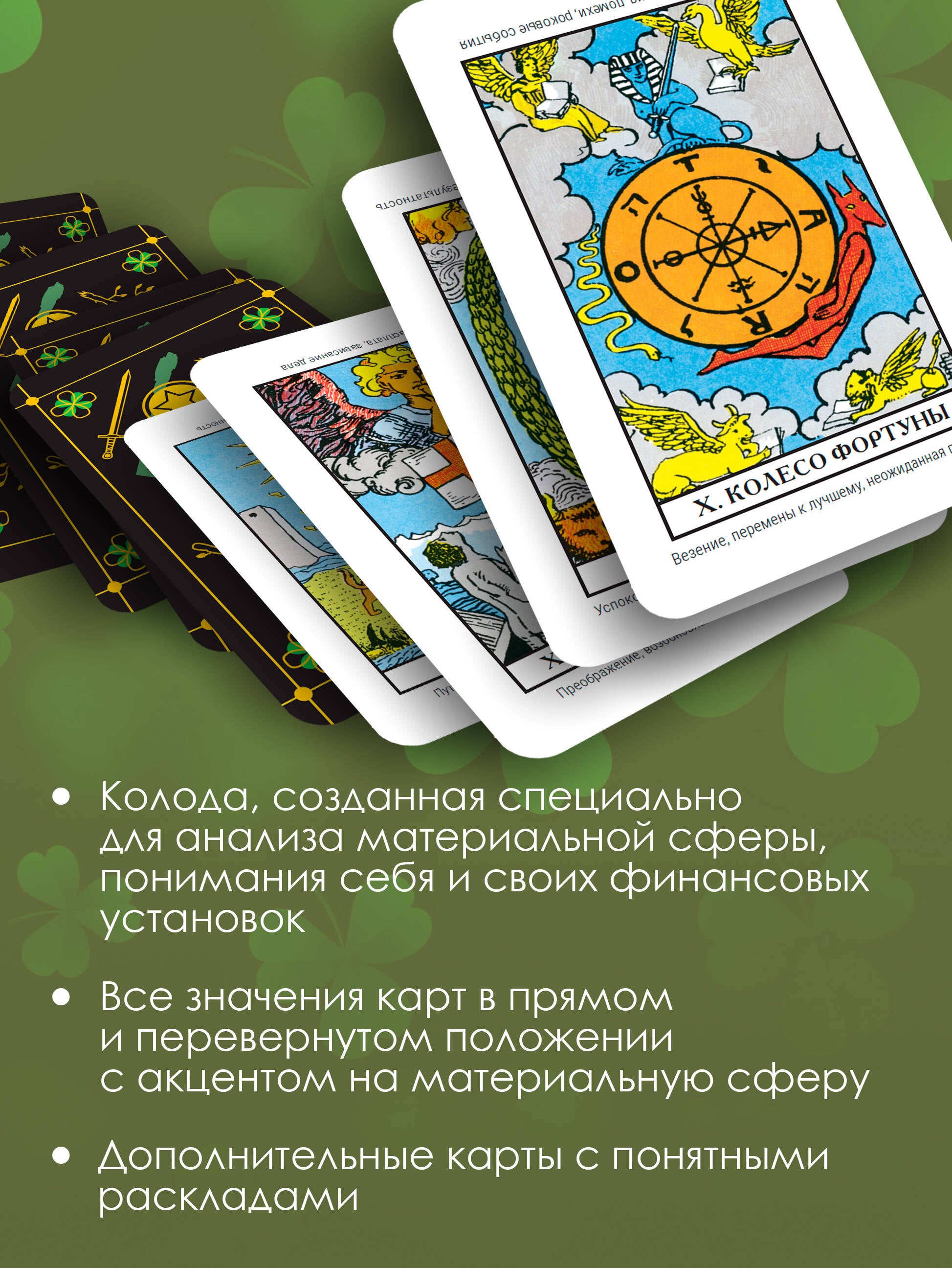 Денежная колода - ваш помощник в вопросах финансов и карьеры. В ее основе - классическая система Уэйта-Смит. На каждой карте указаны значения в прямом и перевернутом положении, поэтому вам не потребуется искать дополнительную информацию - все четко и понятно. Эта колода - настоящий инструмент самопознания и анализа. С ее помощью вы сможете выявить свои скрытые модели поведения в отношении денег и увидеть новые перспективы в материальной сфере, а также глубже понять самого себя. Уникальная рубашка с символами четырехлистного клевера, руны Йера и мастей Таро настроит вас на нужное состояние и поможет сфокусироваться на теме финансов и благополучия. Колода состоит из 85 карт - 75 карт Таро и 7 с раскладами, которые будут понятны и интересны как новичку в этой сфере, так и тому, кто давно интересуется темой. Колода также издается в формате большой коробки с руководством под названием "Таро. Денежное гадание. Финансы, карьера, благополучие".| Издательство | Издательство "АСТ" |