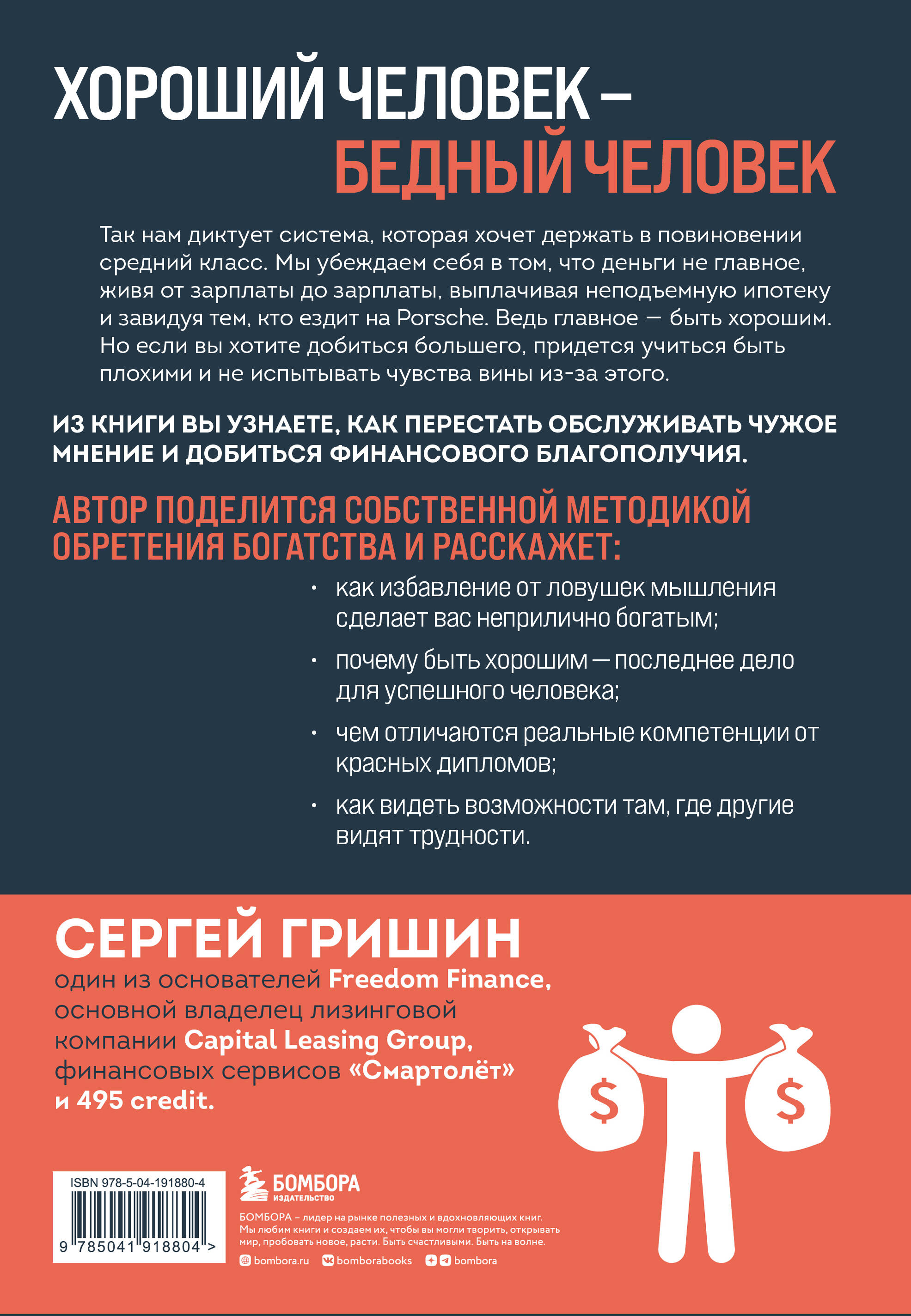 Хороший человек ― бедный человек. Так нам диктует система, которая хочет держать в повиновении средний класс. Мы убеждаем себя в том, что деньги не главное, живя от зарплаты до зарплаты, выплачивая неподъемную ипотеку и завидуя тем, кто ездит на Porsche. Ведь главное ― быть хорошим. Но если вы хотите добиться большего, придется учиться быть плохими и не испытывать чувство вины из-за этого. Сергей Гришин ― один из основателей Freedom Finance, основной владелец лизинговой компании Capital Leasing Group, финансовых сервисов «Смартолёт» и «495 credit». Из книги вы узнаете, как перестать обслуживать чужое мнение и добиться финансового благополучия. Автор поделится собственной методикой обретения богатства и расскажет: • как избавление от ловушек мышления сделает вас неприлично богатым; • почему быть хорошим - последнее дело для успешного человека; • чем отличаются реальные компетенции от красных дипломов; • как видеть возможности там, где другие видят трудности.| Издательство | ООО "Издательство "Эксмо" |
