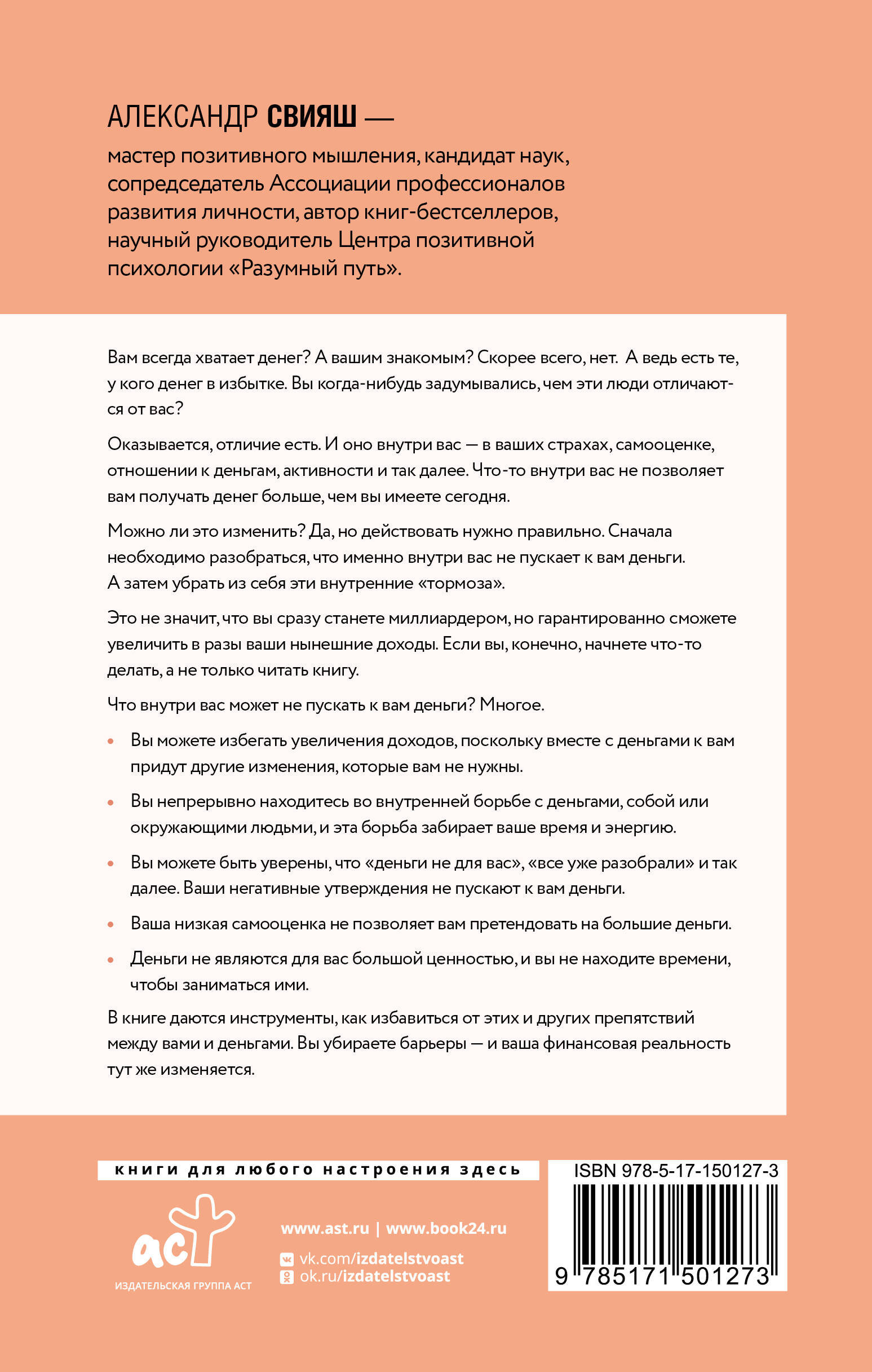 Александр Свияш - мастер позитивного мышления, кандидат наук, сопредседатель Ассоциации профессионалов развития личности, автор книг-бестселлеров, научный руководитель Центра позитивной психологии "Разумный путь". Вам всегда хватает денег? А вашим знакомым? Скорее всего, нет. А ведь есть те, у которых денег в избытке. Вы когда-нибудь задумывались, чем эти люди отличаются от вас? Оказывается, отличие есть. И оно внутри вас - в ваших страхах, самооценке, отношении к деньгам, активности и так далее. Что-то внутри вас не позволяет вам получать денег больше, чем вы имеете сегодня, Можно ли это изменить? Да, но действовать нужно правильно. Сначала необходимо разобраться, что именно внутри вас не пускает к вам деньги. А затем убрать из себя эти внутренние "тормоза". Это не значит, что вы сразу станете миллиардером, но гарантированно сможете увеличить в разы ваши нынешние доходы. Если вы, конечно, начнете что-то делать, а не только читать книгу. Что внутри вас может не пускать к вам деньги? Многое. • Вы можете избегать увеличения доходов, поскольку вместе с деньгами к вам придут другие изменения, которые вам не нужны. • Вы непрерывно находитесь во внутренней борьбе с деньгами, собой или окружающими людьми, и эта борьба забирает ваше время и энергию. • Вы можете быть уверены, что "деньги не для вас", "все уже разобрали" и так далее. Ваши негативные утверждения не пускают к вам деньги. • Ваша низкая самооценка не позволяет вам претендовать на большие деньги. • Деньги не являются для вас большой ценностью, и вы не находите времени, чтобы заниматься ими. В книге "Деньги внутри вас. Уберите барьеры перед деньгами" даются инструменты, как убрать эти и другие барьеры между вами и деньгами. Вы убираете эти барьеры - и ваша финансовая реальность тут же изменяется.| Издательство | ИЗДАТЕЛЬСТВО "АСТ" |