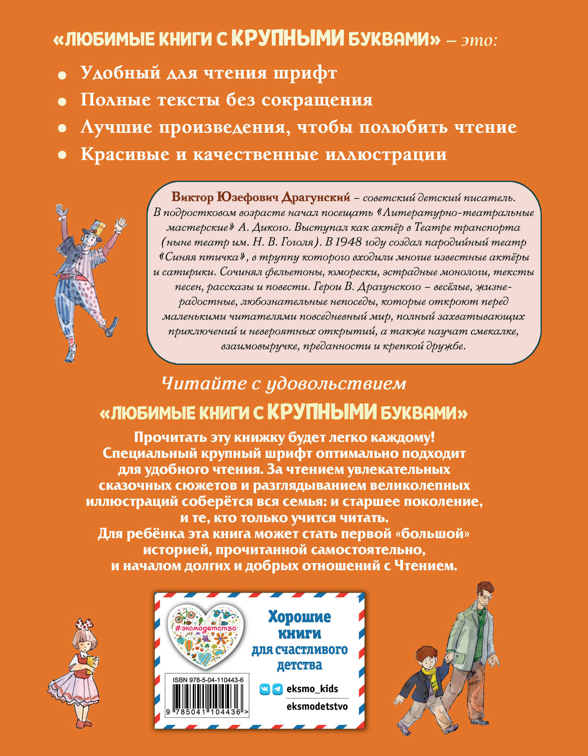 Что значит «тайное становится явным»? Что может произойти, если выкинуть манную кашу в окно? Какая буква заколдована? Эти и многие другие секреты откроет маленьким читателям юмористический сборник рассказов о Дениске Кораблёве. ОБ АВТОРЕ Виктор Драгунский - советский писатель, автор повестей и рассказов. Его цикл «Денискины рассказы» - это весёлые и добрые истории, ставшие классикой детской литературы. В них есть место и приключениям, и юмору, и дружбе. Рассказы из сборника неоднократно экранизировались в виде фильмов, спектаклей и мюзиклов. О ЧЁМ КНИГА С весёлым и неунывающим мальчуганом Дениской Кораблёвым всегда случаются забавные и курьёзные приключения. 16 смешных и светлых историй расскажут о настоящей дружбе, семейных ценностях, об искренности, доброте и взаимовыручке. ОСОБЕННОСТИ КНИГИ • Крупный и удобный шрифт для чтения. • Произведения из сборника входят в школьную программу и список по внеклассному чтению. • Идеально подходит для первого самостоятельного чтения. • Сборник юмористических рассказов о жизни непоседливого школьника Дениски Кораблёва поднимет настроение и вызовет улыбку. • Выразительные акварельные иллюстрации современного российского художника Андрея Крысова. О СЕРИИ «Любимые книги с крупными буквами» - это полные тексты классических произведений детской литературы, крупный и удобный для чтения шрифт, позволяющий ребёнку читать книгу как со взрослыми, так и самостоятельно.| Издательство | ООО "Издательство "Эксмо" |