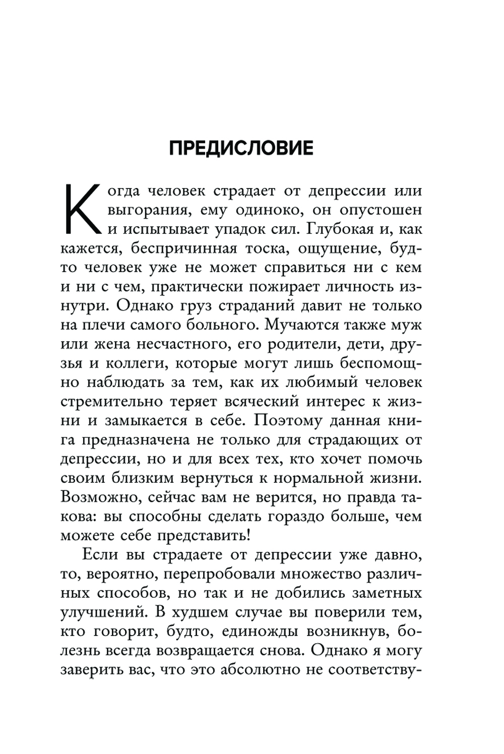 Когда человек страдает от депрессии или выгорания, ему одиноко, он опустошен и испытывает упадок сил. Глубокая и, как кажется, беспричинная тоска, ощущение, будто человек уже не может справиться ни с кем и ни с чем, практически пожирает личность изнутри. Однако груз страданий давит не только на него самого, но и на его близких. Из-за дня в день они наблюдают, как их любимый человек стремительно теряет всяческий интерес к жизни и замыкается в себе. Поэтому данная книга предназначена не только для страдающих от депрессии, но и для всех тех, кто хочет помочь своим близким вернуться к нормальной жизни. Возможно, вам сейчас не верится, но вы способны сделать гораздо больше, чем можете себе представить!| Издательство | Эксмо |