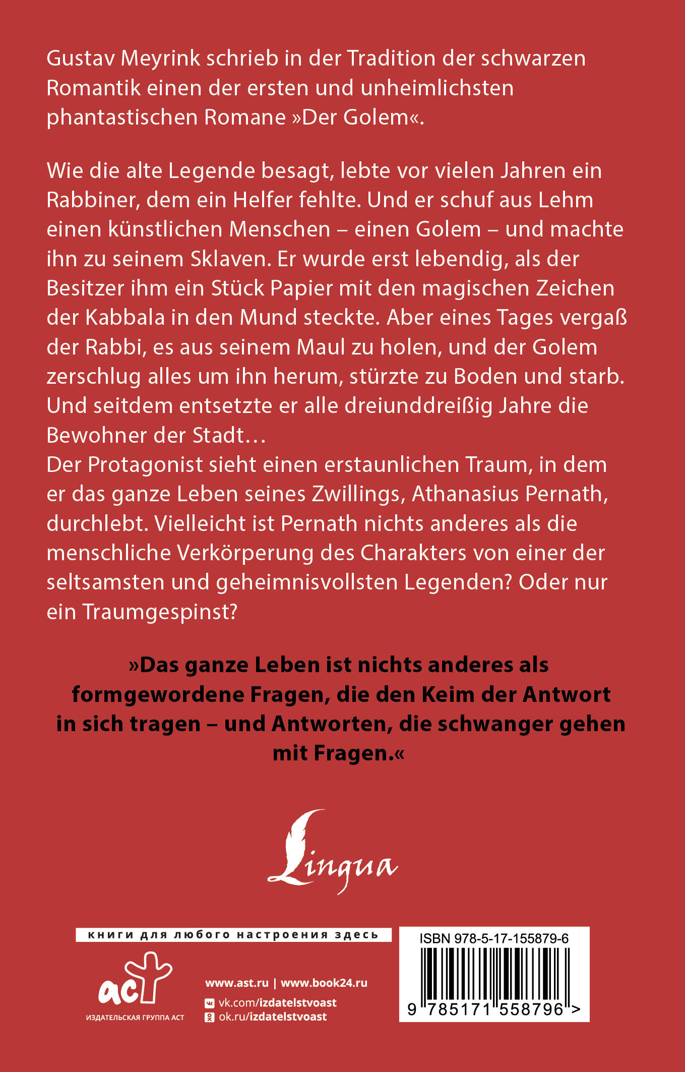 Издание на немецком языке. "Голем" - признанный шедевр экспрессионистской литературы, принесший австрийскому писателю Густаву Майринку мировую славу. Написанный в жанре магического реализма, роман переносит читателя в загадочную Прагу, где главному герою стали являться удивительные сны. В них он проживает жизнь своего двойника Атанасиуса Перната - владельца шляпы, которую он по ошибке взял вместо своей. Существует ли Пернат в реальности, или он - всего лишь плод сновидения? А возможно, Пернат - человеческое воплощение глиняного монстра Голема, оживающего с помощью каббалистических заклятий раввина? Да и важно ли это, если, пробудившись ото сна, люди "делаются добычей нового сна, более глубокого, чем тот, из которого они только что вышли". Книга издана в неадаптированной версии. Наслаждайтесь мистическим романом Густава Майринка в оригинале!| Издательство | ИЗДАТЕЛЬСТВО "АСТ" |