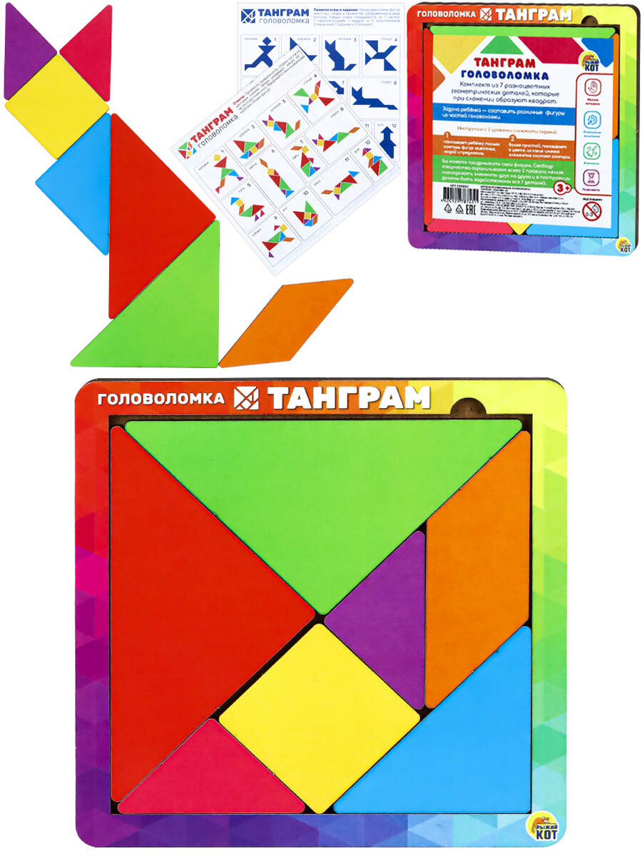 Деревянная игрушка "Танграм" - увлекательная головоломка, которая понравится и детям, и взрослым! Она состоит из плоских фигур, которые необходимо складывать определённым образом для получения другой, более сложной, фигуры. Танграм способствует развитию у детей наглядно-образного мышления, воображения, внимания, понимания цвета, величины и формы, восприятия, комбинаторных способностей.
