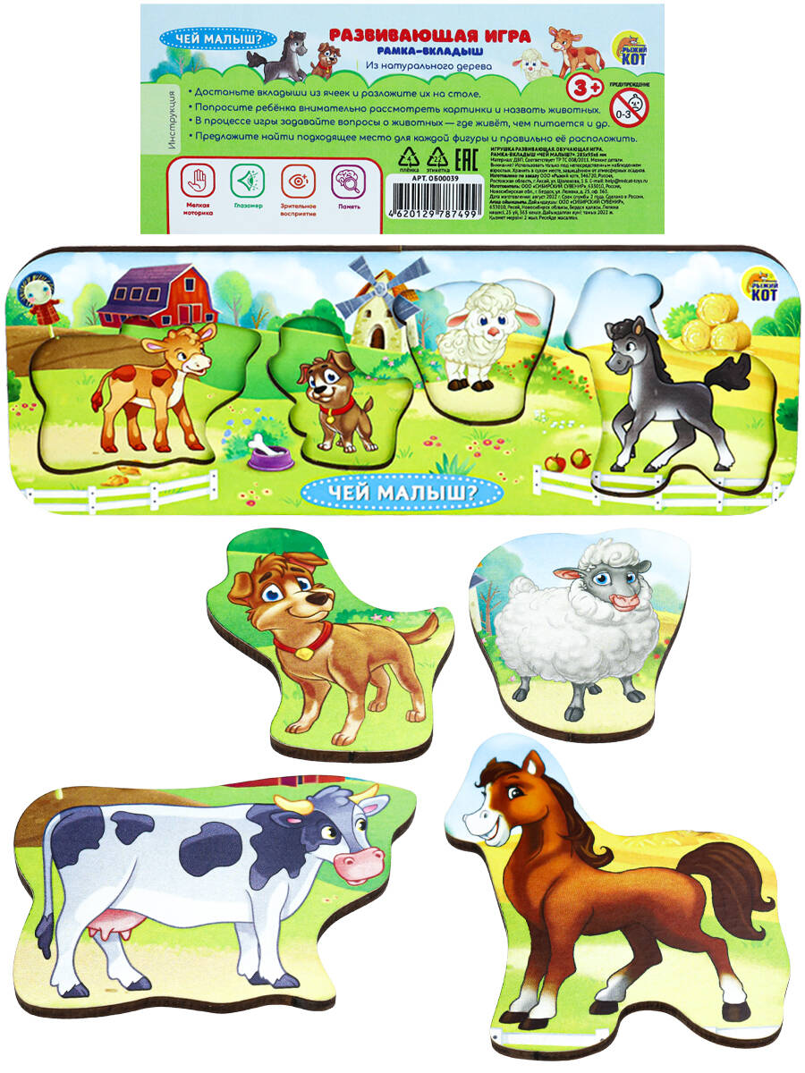 Деревянная рамка-вкладыш "Чей малыш?" придется по душе всем малышам! Собирая картинку, ребенок будет вставлять каждый вкладыш в отверстие соответствующей формы, учась подбирать отдельные составные части по размеру, форме и цвету. Игра с такой рамкой-вкладышем поможет деткам развить внимание, воображение, логическое мышление, усидчивость, цветовосприятие и моторику. Размер: 204х71х6 мм.| Издательство | РЫЖИЙ КОТ ООО |