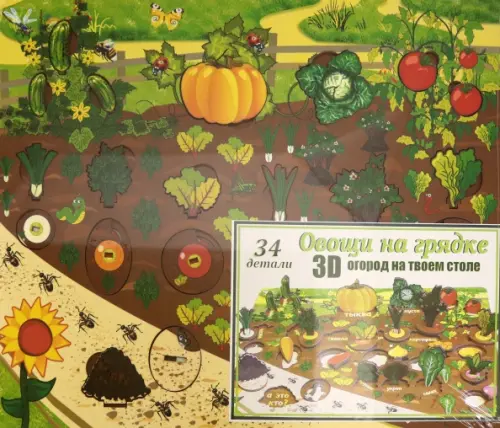 В рамке предусмотрены 34 фигурных выемки для аналогичного количества вкладышей в виде различных видов овощей и зелени. Подобная игрушка несет в себе не только развлекательную, но еще и познавательную функцию.