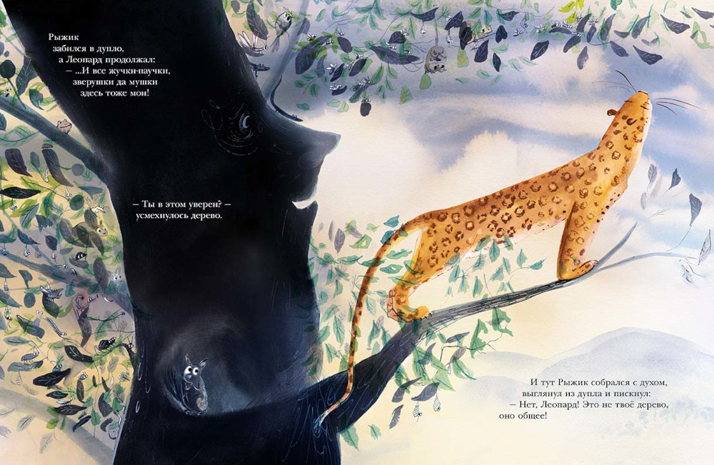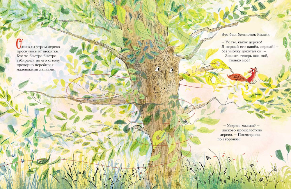 Однажды бельчонок Рыжик нашёл высокое и красивое дерево. Как же он обрадовался! Такое отличное дерево - и только для него одного. Он будет жить здесь, наслаждаясь тишиной, покоем и полной свободой, и никто-никто не будет ему мешать! Но вскоре выяснилось, что это замечательное дерево нравилось не только Рыжику. Своим домом дерево считали и птицы, которые любили отдыхать на его ветвях. И гусеницы, которые поедали вкусные листочки. И букашки, которые жили под корой. И звери, которые приходили почесать спинку о шершавый ствол... Нет, делить дерево с соседями Рыжик не собирался. Поэтому он решил отправиться на поиски другого дома - только для себя одного. Правда, далеко уйти ему не удалось. Внезапно Рыжик угодил в лапы леопарда, который, как ни странно, тоже считал дерево исключительно своим, поскольку любил отдыхать в его прохладной тени. Кроме того, хищник был уверен, что все обитатели дерева также принадлежат ему, леопарду... Как же он ошибался. Никто из насекомых и мелких зверушек, населявших дерево, не считал себя ничьей собственностью. Объединив усилия, они не только спасли Рыжика, но и навсегда прогнали леопарда. Эта книга даст повод поговорить с ребёнком о важных вещах: о желании присваивать и умении делиться; о жизни в одиночку и в близком соседстве. Иными словами, о жизни в социуме, в общем пространстве, будь то семья, дом, целый город или даже вся наша планета. Кроме того, с этой книжкой-картинкой можно поиграть, как с виммельбухом. Кто сумеет показать и назвать всех насекомых и зверушек на дереве? А вот задание для самых внимательных: начиная с самого первого разворота, отыщите на страницах книги серую белочку, которая всю дорогу украдкой наблюдает за Рыжиком из густой листвы.| Издательство | Мелик-Пашаев |