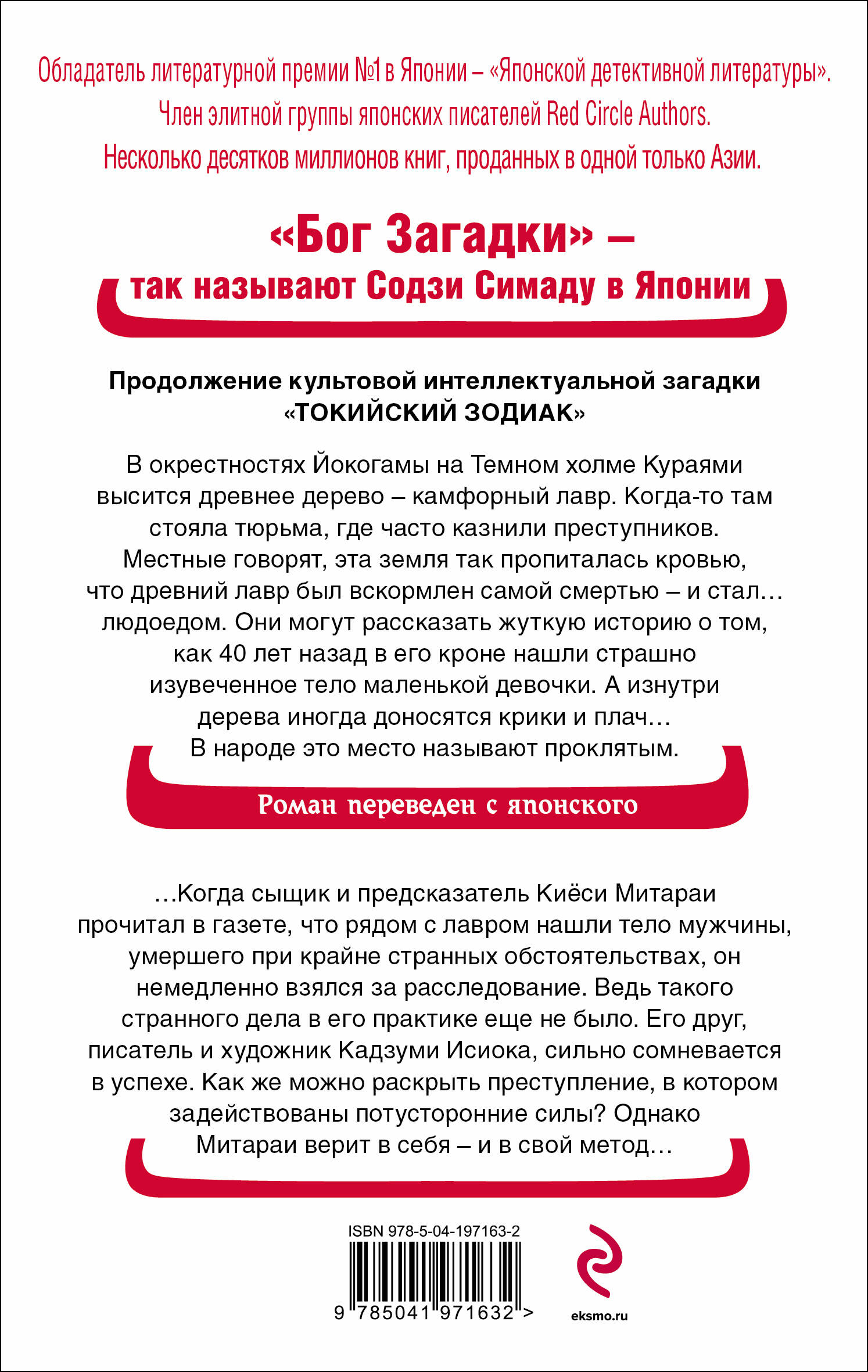 ПРОДОЛЖЕНИЕ КУЛЬТОВОЙ ИНТЕЛЛЕКТУАЛЬНОЙ ЗАГАДКИ «ТОКИЙСКИЙ ЗОДИАК». УНИКАЛЬНАЯ ГОЛОВОЛОМКА С ДЕРЕВОМ - СЕРИЙНЫМ УБИЙЦЕЙ. Сложно представить себе нечто более кошмарное и пугающее, чем то, что случилось осенью 1984 года. Этот страшный инцидент на Темном холме в Йокогаме потряс всю Японию… В окрестностях Йокогамы на Темном холме Кураями высится древнее дерево - камфорный лавр. Когда-то там стояла тюрьма, где часто казнили преступников. Местные говорят, эта земля так пропиталась кровью, что древний лавр был вскормлен самой смертью - и стал… людоедом. Они могут рассказать жуткую историю о том, как 40 лет назад в его кроне нашли страшно изувеченное тело маленькой девочки. А изнутри дерева иногда доносятся крики и плач… В народе это место называют проклятым. …Когда сыщик и предсказатель Киёси Митараи прочитал в газете, что рядом с лавром нашли тело мужчины, умершего при крайне странных обстоятельствах, он немедленно взялся за расследование. Ведь такого странного дела в его практике еще не было. Его друг, писатель и художник Кадзуми Исиока, сильно сомневается в успехе. Как же можно раскрыть преступление, в котором задействованы потусторонние силы? Однако Митараи верит в себя - и в свой метод… «Бог Загадки» - так называют Содзи Симаду в Японии. Обладатель литературной премии № 1 в Японии - «Японской детективной литературы». Член элитной группы японских писателей Red Circle Authors. Несколько десятков миллионов книг, проданных в одной только Азии. _____________________________________________________________ «Великий Содзи Симада буквально изобрел целый поджанр "логической загадки"...» - The Guardian «Симада умеет сочетать совершенно фантастические преступления с логичными и прозрачными решениями этих загадок - и способен завести в тупик самого проницательного читателя». - Publishers Weekly| Издательство | ООО "Издательство "Эксмо" |
