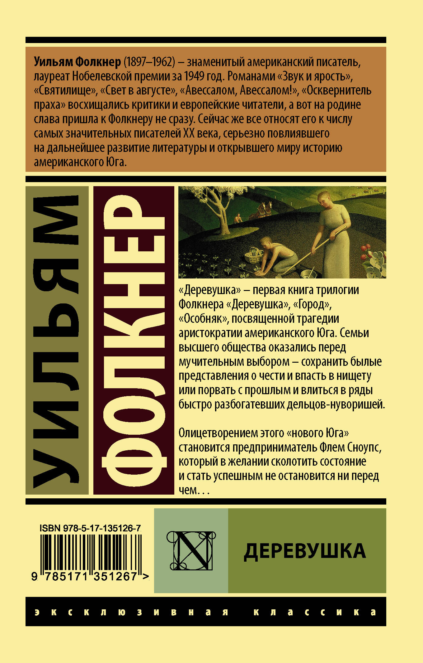 "Деревушка" - первая книга трилогии Фолкнера "Деревушка", "Город", "Особняк", посвященной трагедии аристократии американского Юга. Семьи высшего общества оказались перед мучительным выбором - сохранить былые представления о чести и впасть в нищету или порвать с прошлым и влиться в ряды быстро разбогатевших дельцов-нуворишей. Олицетворением этого "нового Юга" становится предприниматель Флем Сноупс, который в желании сколотить состояние и стать успешным не остановится ни перед чем…| Издательство | ИЗДАТЕЛЬСТВО "АСТ" |