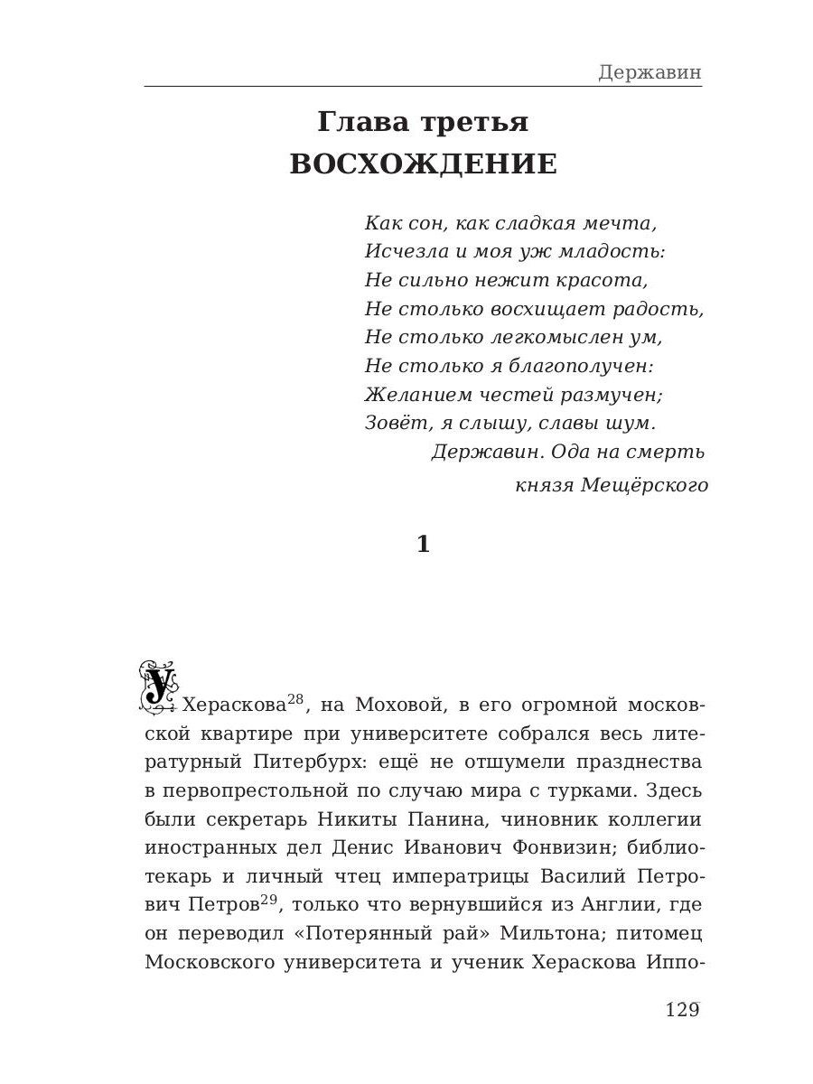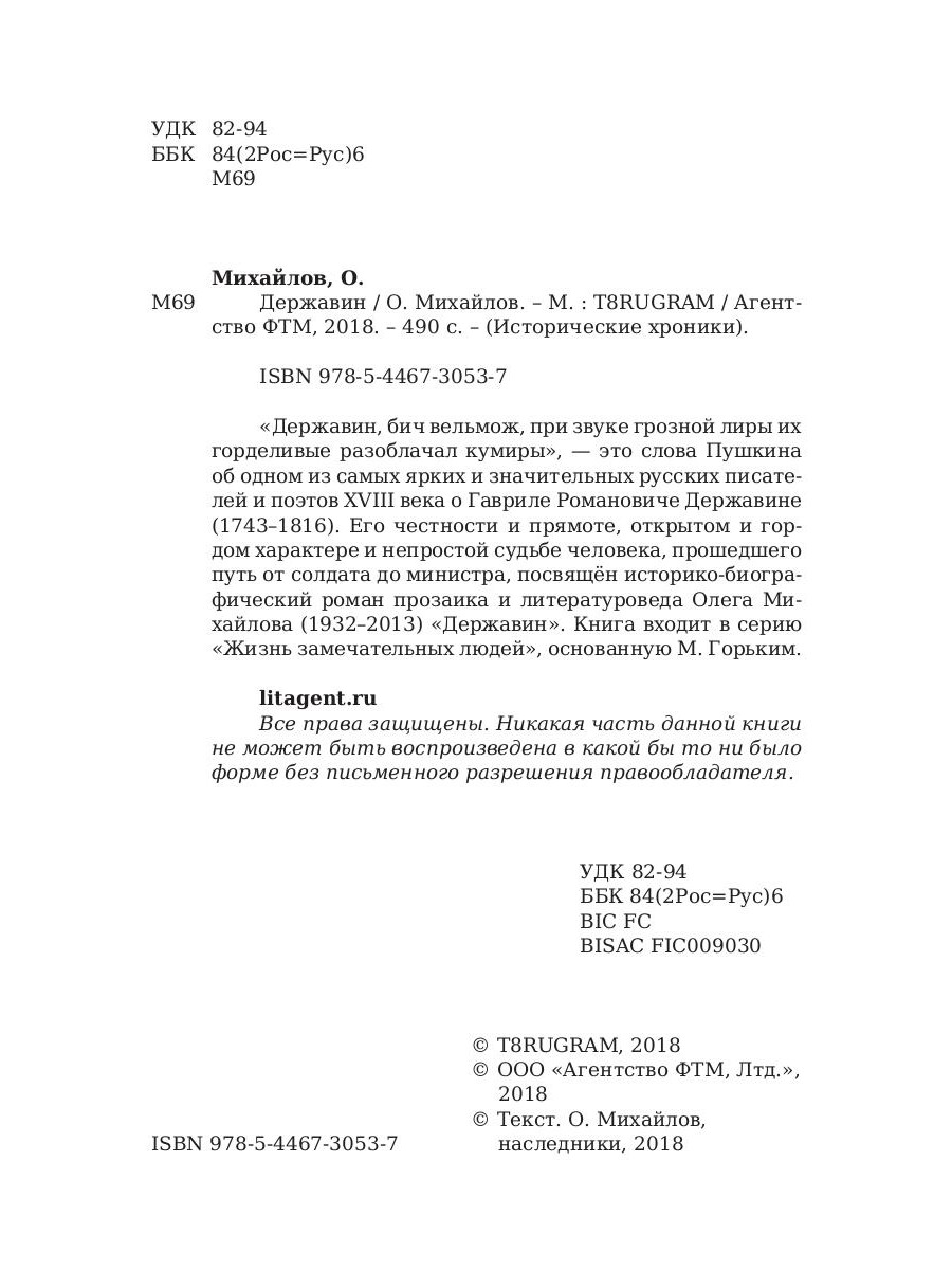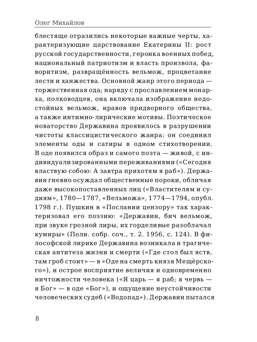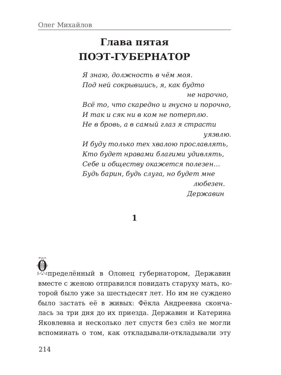 «Державин, бич вельмож, при звуке грозной лиры их горделивые разоблачал кумиры», - это слова Пушкина об одном из самых ярких и значительных русских писателей и поэтов XVIII века о Гавриле Романовиче Державине (1743-1816). Его честности и прямоте, открытом и гордом характере и непростой судьбе человека, прошедшего путь от солдата до министра, посвящен историко-биографический роман прозаика и литературоведа Олега Михайлова (1932-2013) «Державин». Книга входит в серию «Жизнь замечательных людей», основанную М. Горьким.