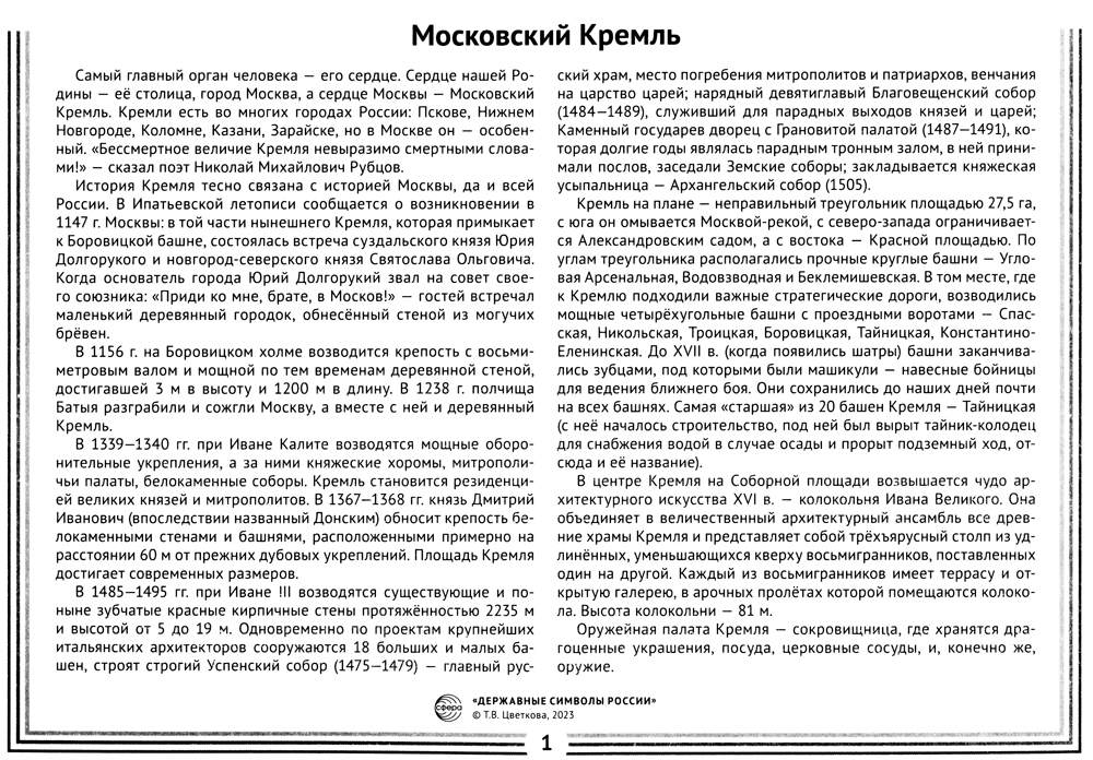 В комплекте демонстрационных материалов «Державные символы России» рассматриваются такие важнейшие понятия, как Конституция, государственные символы - гимн, флаг и герб, которые в ходе исторического развития приобрели функции объединения людей, выражения нравственных идеалов государства, служения стране, символы воинской доблести и героизма - знамя Победы, георгиевская ленточка, Андреевский флаг, а также архитектурный символ нашей страны - Московский Кремль. Знания даются сжато, но в достаточном для ребенка 6-11 лет объеме. Работа с материалами поможет дошкольникам и младшим школьникам расширить кругозор и ближе познакомиться с родной культурой. Пособие подходит для индивидуальной и групповой работы.| Издательство | Творческий центр Сфера |