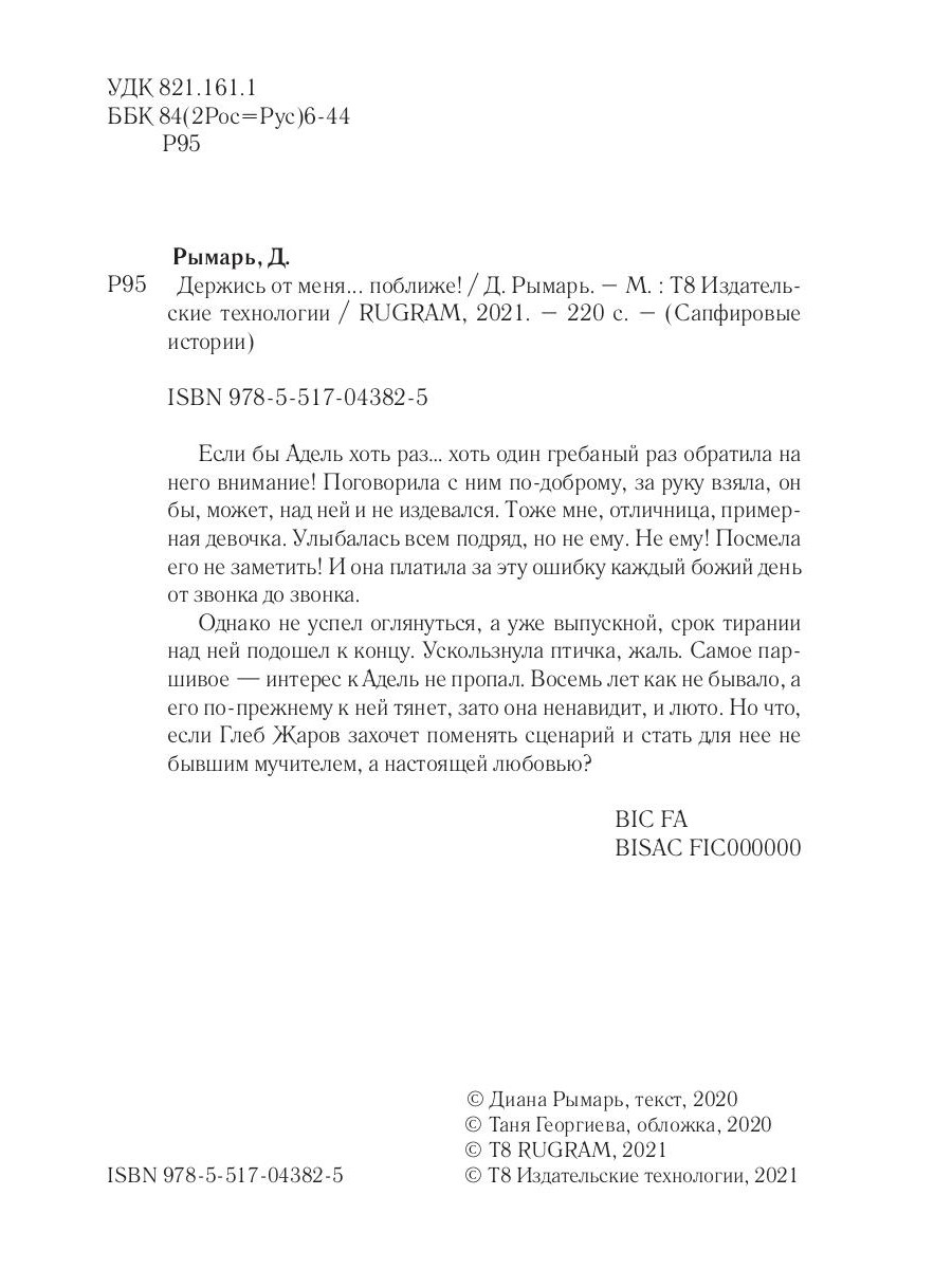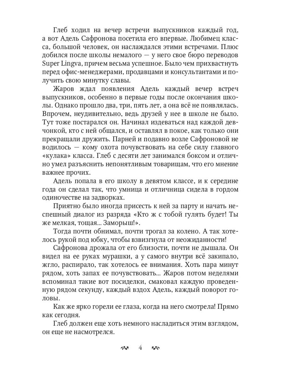 Если бы Адель хоть раз… хоть один гребаный раз обратила на него внимание! Поговорила с ним по-доброму, за руку взяла, он бы, может, над ней и не издевался. Тоже мне, отличница, примерная девочка. Улыбалась всем подряд, но не ему. Не ему! Посмела его не заметить! И она платила за эту ошибку каждый божий день от звонка до звонка. Однако не успел оглянуться, а уже выпускной, срок тирании над ней подошел к концу. Ускользнула птичка, жаль. Самое паршивое - интерес к Адель не пропал. Восемь лет как не бывало, а его по-прежнему к ней тянет, зато она ненавидит, и люто. Но что, если Глеб Жаров захочет поменять сценарий и стать для нее не бывшим мучителем, а настоящей любовью?| Издательство | Т8 RUGRAM |