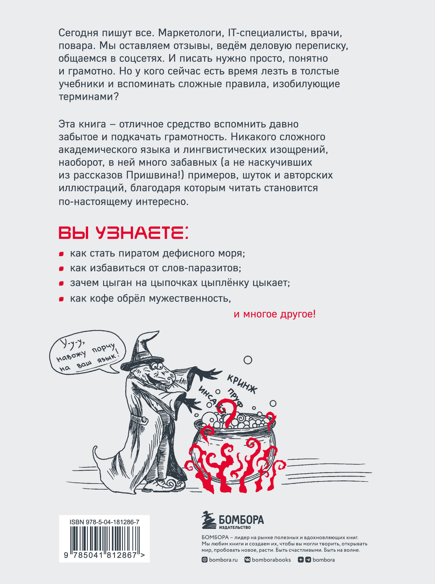 Сегодня пишут все. Маркетологи, IT-специалисты, врачи, повара. Мы оставляем отзывы, ведём деловую переписку, общаемся в соцсетях. И писать нужно просто, понятно и грамотно. Но у кого сейчас есть время лезть в толстые учебники и вспоминать сложные правила, изобилующие терминами? Эта книга - отличное средство вспомнить «давно забытое» и подкачать грамотность. Никакого сложного академического языка и лингвистических изощрений, наоборот, в ней много забавных (а не наскучивших, из рассказов Пришвина!) примеров, шуток и авторских иллюстраций, благодаря которым читать становится по-настоящему интересно. Вы узнаете: • как стать пиратом дефисного моря; • как избавиться от слов-паразитов; • зачем цыган на цыпочках цыплёнку цыкает; • как кофе обрёл мужественность... И многое другое!| Издательство | ООО "Издательство "Эксмо" |
