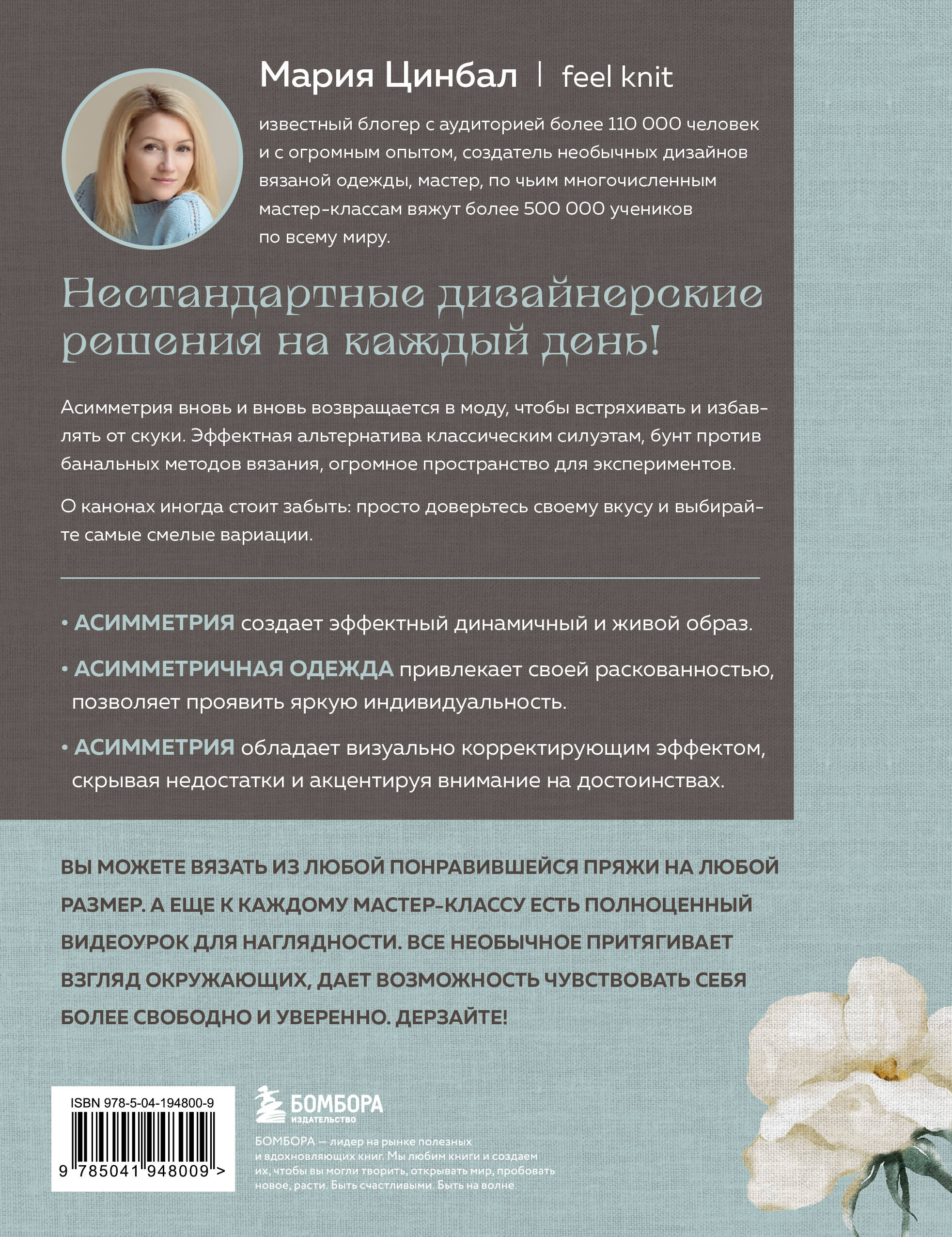 Нестандартные дизайнерские решения на каждый день! Недаром говорят - стиль это в первую очередь смелость идти нестандартными путями. О вязальных канонах иногда стоит забыть: просто доверьтесь своему вкусу и выбирайте самые яркие модели. Асимметрия вновь и вновь возвращается в моду, чтобы встряхивать рутину и избавлять от скуки. • Асимметрия создает эффектный динамичный и живой образ. • Асимметричная одежда привлекает своей раскованностью, позволяет проявить яркую индивидуальность. • Асимметрия обладает визуально корректирующим эффектом, скрывая недостатки и акцентируя внимание на достоинствах. В книге популярного мастера и блогера Марии Цинбал вы найдете все, что необходимо, чтобы шагнуть на новую ступень стильного вязания: • Основы асимметричного дизайна: эксперименты с конструкцией, текстурой, колористикой, узорами и фактурами, нестандартные формы. • Мастер-классы по вязанию 10 изделий: жилетов, свитеров, джемперов, кардиганов. • Различные техники: реглан снизу, реглан сверху, реглан-погон, спущенное плечо. Вязание - это не скучно, а захватывающе интересно, а результат - настоящая победа над стереотипами! Роскошный подарок для любой вязальщицы, которая идет в ногу со временем. Об авторе: Мария Цинбал \ feel knit - известный блогер c аудиторией более 110 000 человек и с огромным опытом, создатель необычных дизайнов вязаной одежды, мастер, по чьим многочисленным мастер-классам вяжут более 500 000 учеников по всему миру.| Издательство | ООО "Издательство "Эксмо" |
