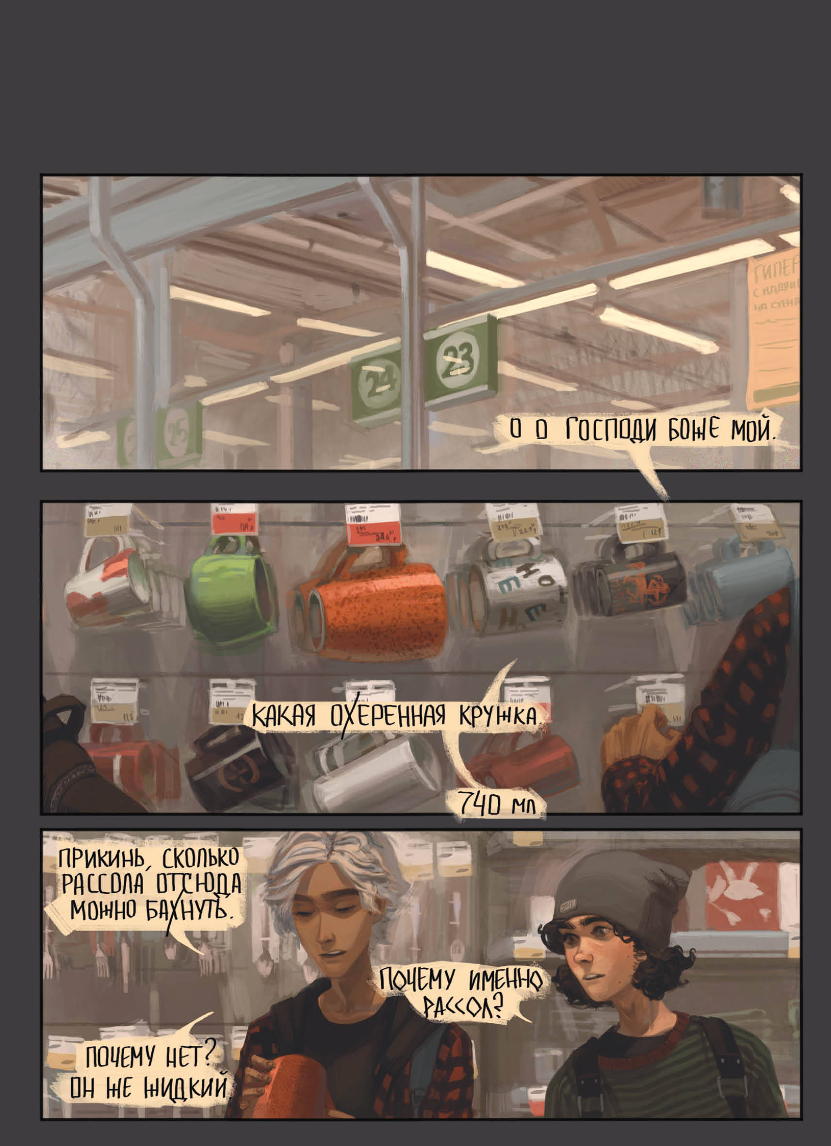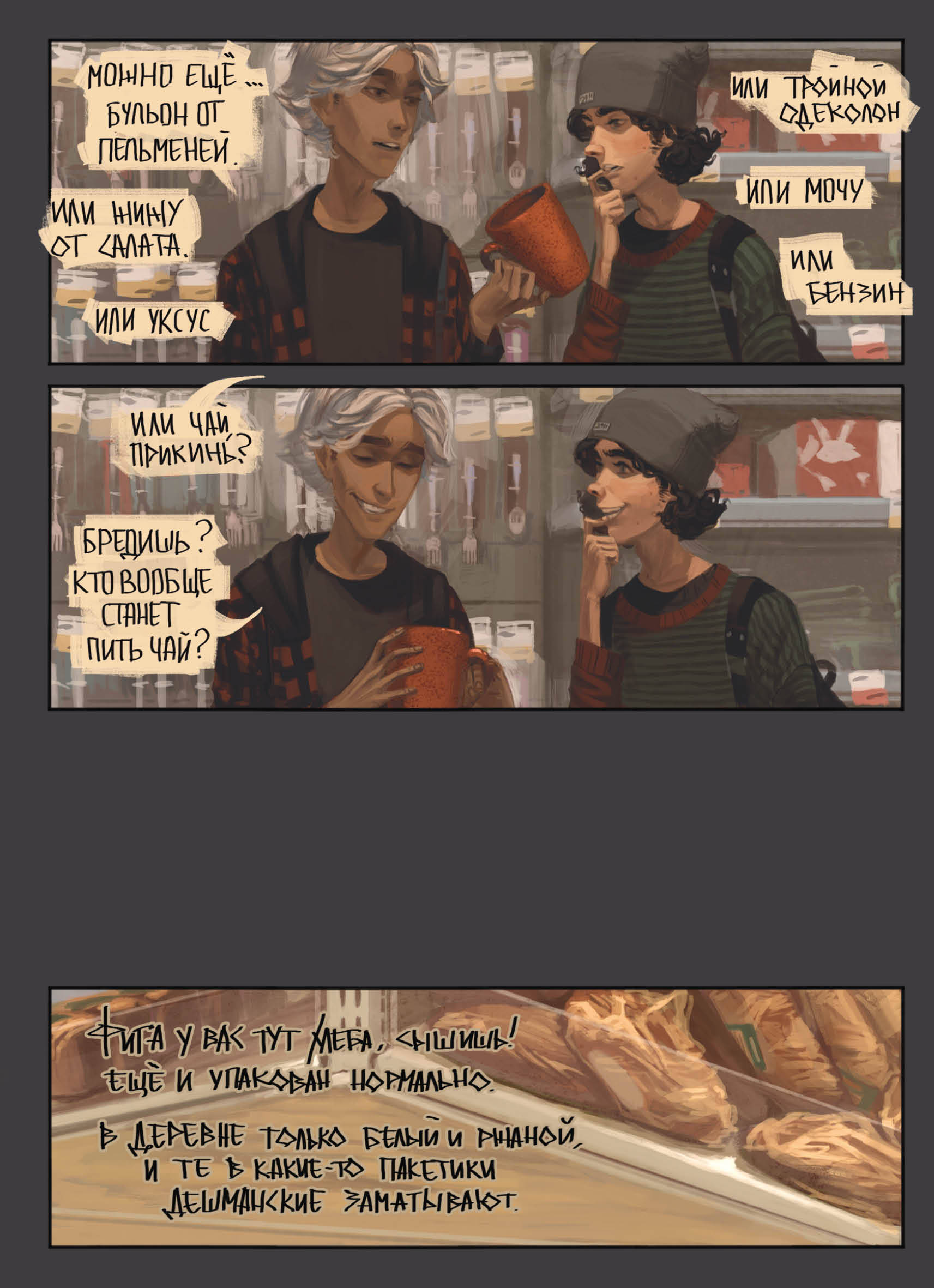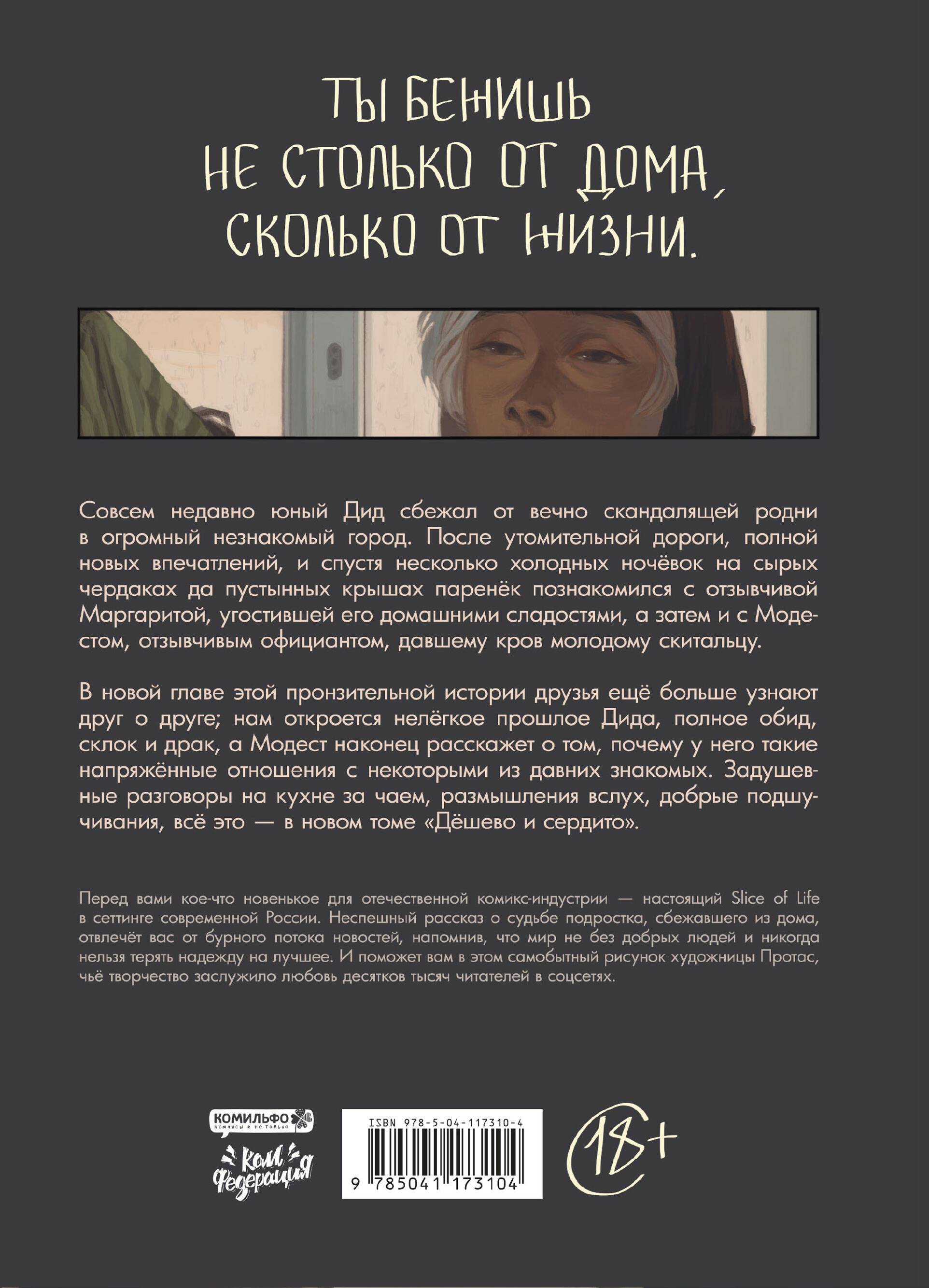 Совсем недавно юный Дид сбежал от вечно скандалящей родни в огромный незнакомый город. После утомительной дороги, полной новых впечатлений, и спустя несколько холодных ночёвок на сырых чердаках да пустынных крышах паренёк познакомился с отзывчивой Маргаритой, угостившей его домашними сладостями, а затем и с Модестом, отзывчивым официантом, давшему кров молодому скитальцу. В новой главе этой пронзительной истории друзья ещё больше узнают друг о друге; нам откроется нелёгкое прошлое Дида, полное обид, склок и драк, а Модест наконец расскажет о том, почему у него такие напряжённые отношения с некоторыми из давних знакомых. Задушевные разговоры на кухне за чаем, размышления вслух, добрые подшучивания, всё это - в новом томе "Дёшево и сердито". Художница Мария Протас - одна из ярчайших представителей российской комикс-индустрии последних лет. Первый том её рассказа о судьбе подростка, ищущего своё место в мире - "Дёшево и сердито. Выход в город" - покорил сердца тысяч читателей, мгновенно ворвавшись в ряд бестселлеров и потеснив популярнейшие зарубежные тайтлы. Данная книга является прямым продолжением начатого повествования, в котором мы возвращаемся к уже полюбившимся героям.| Издательство | ООО "Издательство "Эксмо" |
