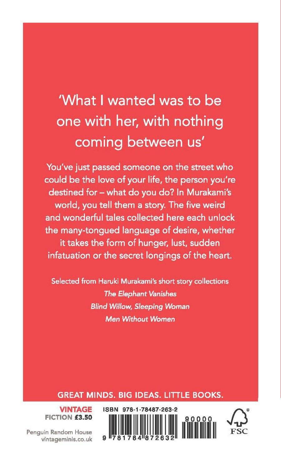 You've just passed someone on the street who could be the love of your life, the person you're destined for - what do you do? In Murakami's world, you tell them a story. The five weird and wonderful tales collected here each unlock the many-tongued language of desire, whether it takes the form of hunger, lust, sudden infatuation or the secret longings of the heart. Selected from Haruki's Murakami's short story collections The Elephant Vanishes, Blind Willow SHarper Leeping Woman, Men Without Women A series of short books by the world's greatest writers on the experiences that make us human Вы только что встретили на улице кого-то, кто мог бы стать любовью всей вашей жизни, человеком, для которого вы предназначены - что вы делаете? В мире Мураками вы рассказываете ему историю. Каждая из пяти странных и чудесных сказок, собранных здесь, раскрывает многоязычный язык желания, принимает ли оно форму голода, похоти, внезапного увлечения или тайных желаний сердца. Выбрано из сборников рассказов Мураками Харуки "Слон исчезает", "Слепая ива, острая женщина", "Мужчины без женщин". Серия коротких книг величайших писателей мира о переживаниях, которые делают нас людьми.| Издательство | Penguin Books Ltd |