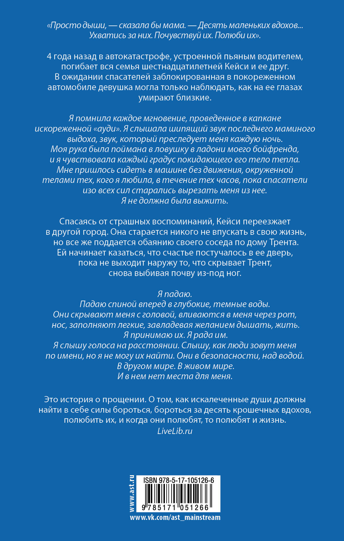 Четыре года назад в автокатастрофе, устроенной пьяным водителем, погибает вся семья шестнадцатилетней Кейси и ее друг. В ожидании спасателей заблокированная в покореженном автомобиле девушка могла только наблюдать, как на ее глазах умирают близкие. Спасаясь от страшных воспоминаний, Кейси переезжает в другой город. Она старается никого не впускать в свою жизнь, но все же поддается обаянию своего соседа по дому Трента. Ей начинает казаться, что счастье постучалось в ее дверь, пока не выходит наружу то, что скрывал ее сосед, снова выбивая почву из-под ног.| Издательство | Издательство "АСТ" |