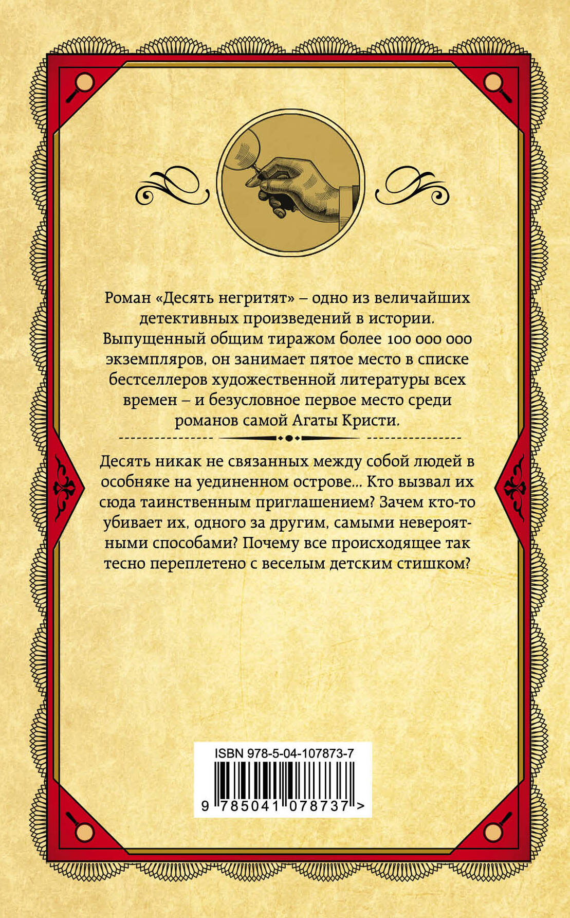 Роман «Десять негритят» - одно из величайших детективных произведений в истории. Выпущенный общим тиражом более 100 000 000 экземпляров, он занимает пятое место в списке бестселлеров художественной литературы всех времен - и безусловное первое место среди романов самой Агаты Кристи. Десять никак не связанных между собой людей в особняке на уединенном острове... Кто вызвал их сюда таинственным приглашением? Зачем кто-то убивает их, одного за другим, самыми невероятными способами? Почему все происходящее так тесно переплетено с веселым детским стишком? Агата Кристи - самый публикуемый автор всех времен и народов после Шекспира. Тиражи ее книг уступают только тиражам его произведений и Библии. В мире продано больше миллиарда книг Кристи на английском языке и столько же - на других языках. Она автор восьмидесяти детективных романов и сборников рассказов, двадцати пьес, двух книг воспоминаний и шести психологических романов, написанных под псевдонимом Мэри Уэстмакотт. Ее персонажи Эркюль Пуаро и мисс Марпл навсегда стали образцовыми героями остросюжетного жанра. -------------------------------------------------- «Несомненно, она гений». - Элизабет Джордж, автор бестселлеров New York Times «Общепринято считать Кристи блестящим мастером острого сюжета. Однако она представляет собой нечто гораздо более значительное». - The Guardian «Если речь о драме с убийством - здесь нет никого изобретательней Кристи». - Sunday Times «…Я до сих пор обожаю романы Кристи». - Луиза Пенни «Читать роман Кристи - словно вгрызаться в спелое яблоко: чистейшее, хрустящее и абсолютное удовлетворение…» - Тана Френч| Издательство | ООО "Издательство "Эксмо" |