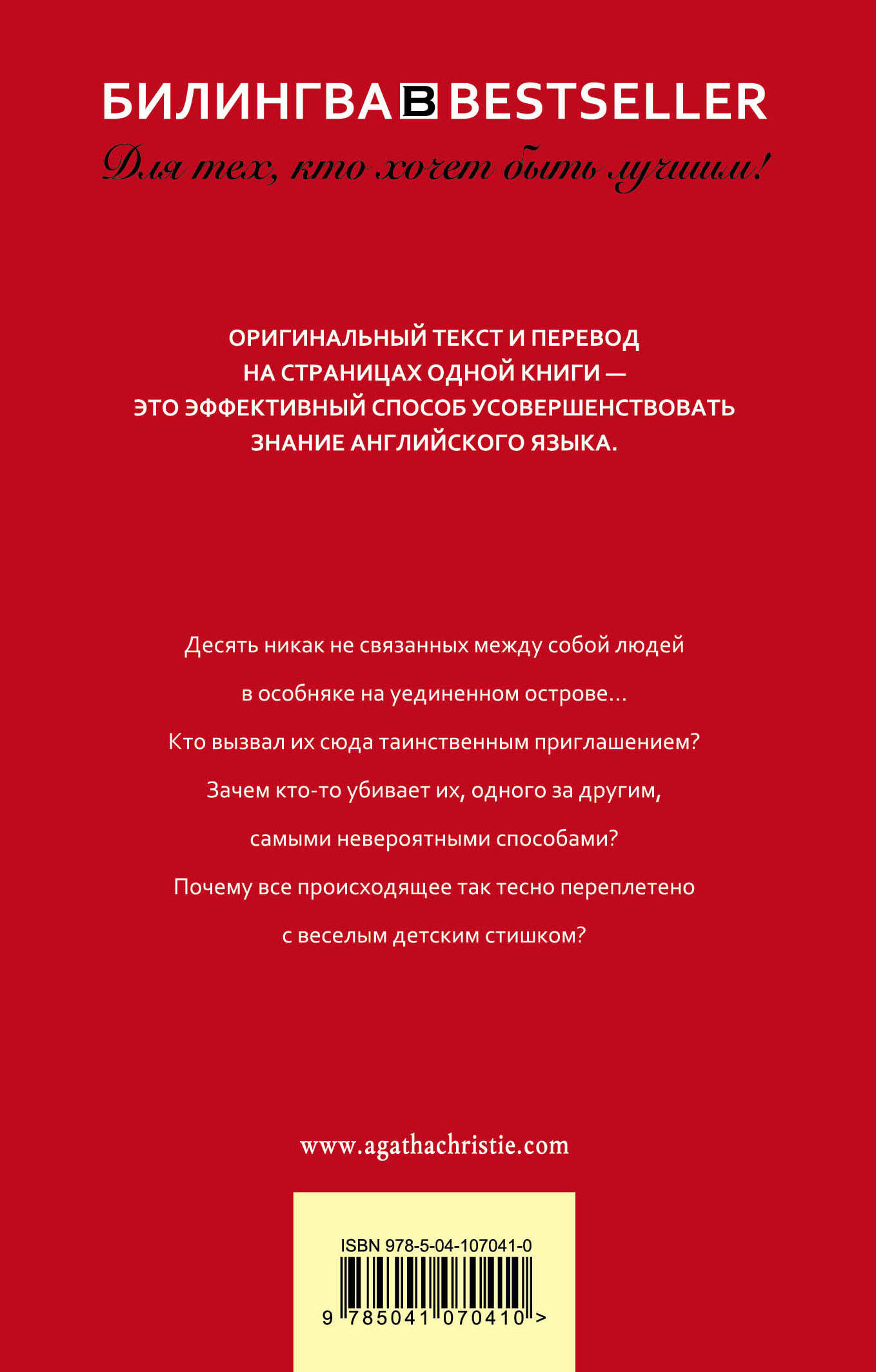 Для тех, кто хочет быть лучшим! Оригинальный текст и перевод на страницах одной книги - это эффективный способ усовершенствовать знание английского языка. Роман «Десять негритят» - одно из величайших детективных произведений в истории. Выпущенный общим тиражом более 100 000 000 экземпляров, он занимает пятое место в списке бестселлеров художественной литературы всех времен - и безусловное первое место среди романов самой Агаты Кристи. «Десять негритят» Агата Кристи считала своим лучшим произведением. Под таким названием роман вышел в 1939 году, все последующие публикации печатались под более политкорректным названием «...И никого не стало». Роман стал первым произведением с темой «идеального убийства», а также послужил примером для создания множества детективных книг и психологических фильмов, в которых полностью или частично использованы приемы из данного произведения. Неоднократно экранизировался, но только советский двухсерийный телефильм Станислава Говорухина полностью соответствовал сюжетной линии с мрачной концовкой. Десять никак не связанных между собой людей в особняке на уединенном острове... Кто вызвал их сюда таинственным приглашением? Зачем кто-то убивает их, одного за другим, самыми невероятными способами? Почему все происходящее так тесно переплетено с веселым детским стишком?