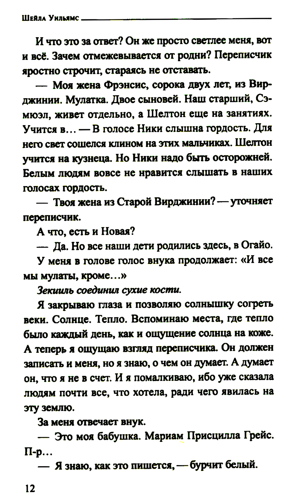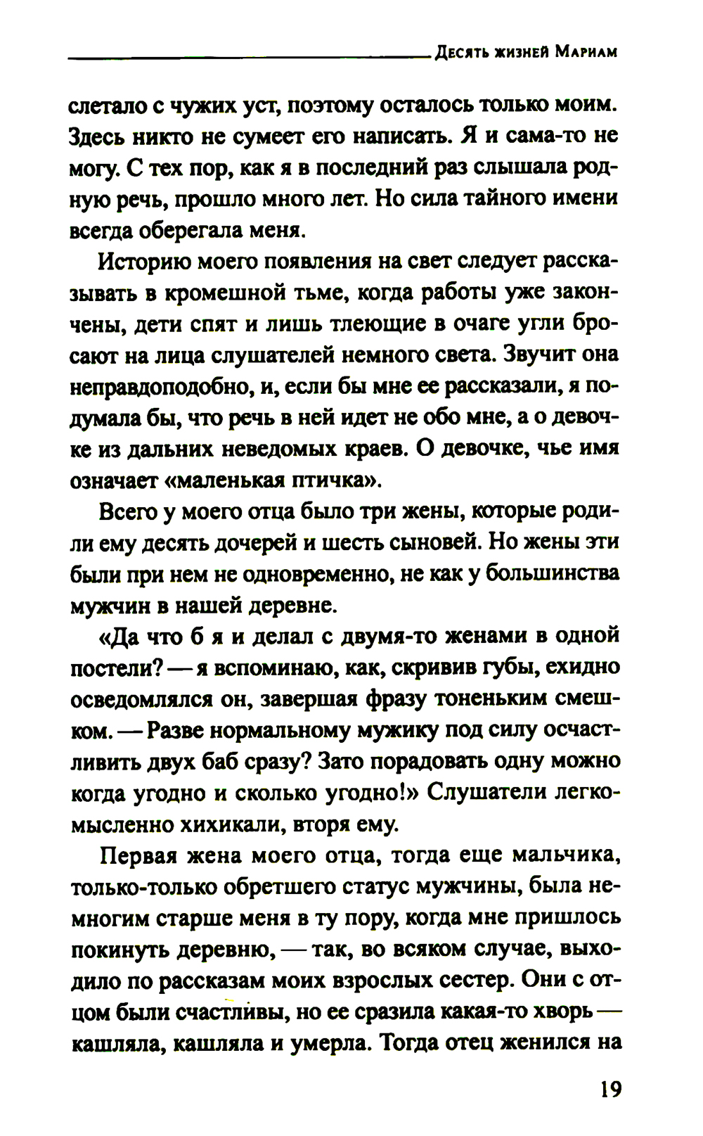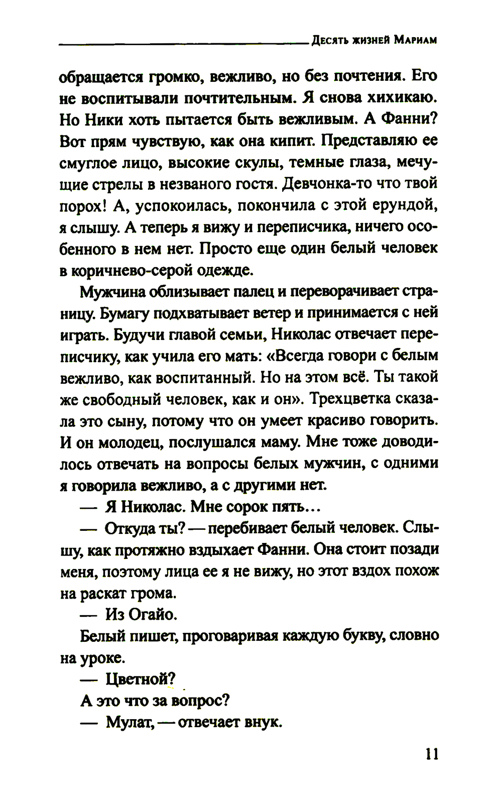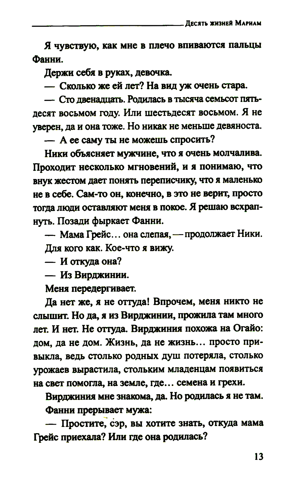 1870 год. В штате Огайо идет перепись населения. Древняя как мир темнокожая старуха дремлет во дворике небольшого домишки. Скучающий переписчик фиксирует ее ответы на вопросы. Имя: Мариам Присцилла Грейс... бывшая рабыня. Родилась: в 17S8 году, а может, и раньше, место рождения... Из памяти старухи поднимаются давно забытые воспоминания: с родовых врат, с собственного непроизносимого имени раскручивается причудливая спираль жизней мамы Грейс, наполненных тяжелым трудом, заботой о больных, но также любовью и, главное, жаждой свободы, о которой родившимся в Африке остается только рассказывать своим детям. «Десять жизней Мариам» - увлекательная историческая эпопея, посвященная путешествию женщины, прозванной «африкской ведьмой», через океан лет, такой же неохватный, как Атлантический, который навсегда разлучил ее с родиной.| Издательство | Иностранка |