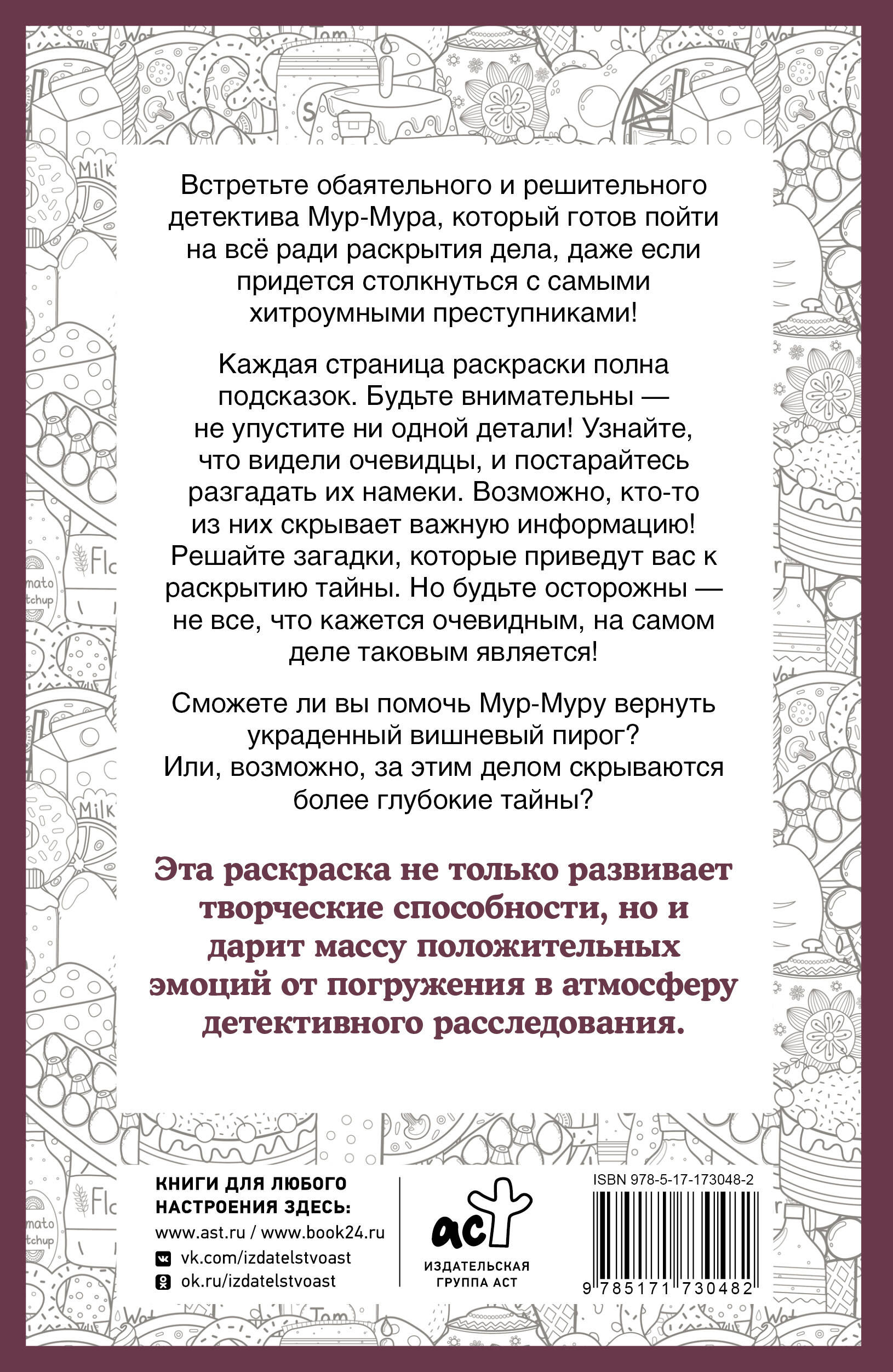 Встретьте обаятельного и решительного детектива Мур-Мура, который готов пойти на всё ради раскрытия дела, даже если придется столкнуться с самыми хитроумными преступниками! Каждая страница раскраски полна подсказок. Будьте внимательны - не упустите ни одной детали! Узнайте, что видели очевидцы, и постарайтесь разгадать их намеки. Возможно, кто-то из них скрывает важную информацию! Решайте загадки, которые приведут вас к раскрытию тайны. Но будьте осторожны - не все, что кажется очевидным, на самом деле таковым является! Сможете ли вы помочь Мур-Муру вернуть украденный вишнёвый пирог? Или, возможно, за этим делом скрываются более глубокие тайны? Эта раскраска не только развивает творческие способности, но и дарит массу положительных эмоций от погружения в атмосферу детективного расследования.