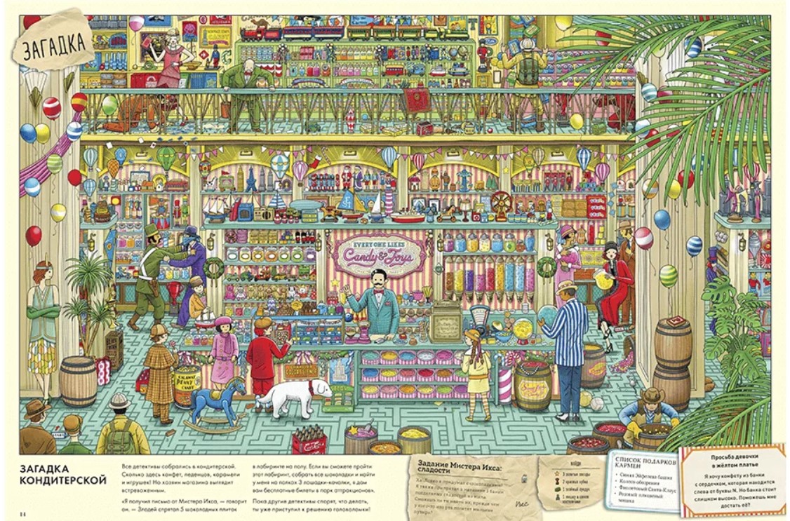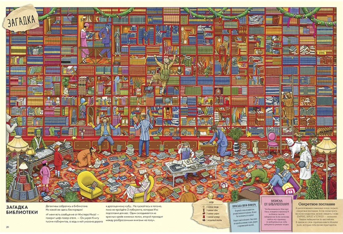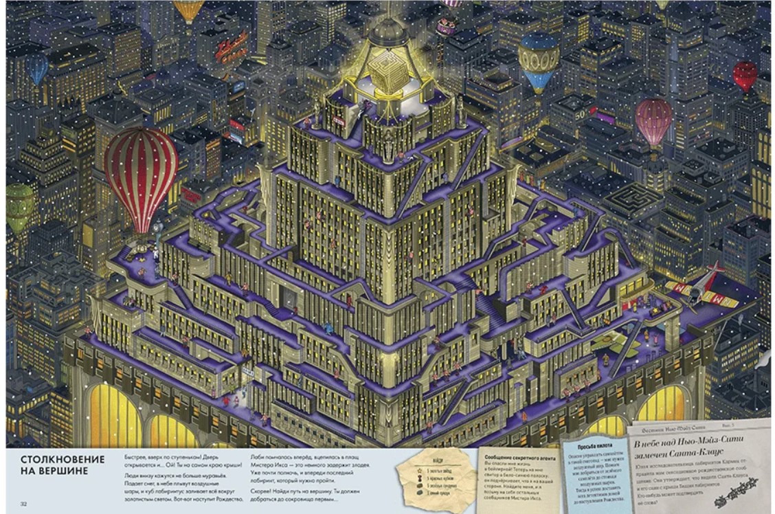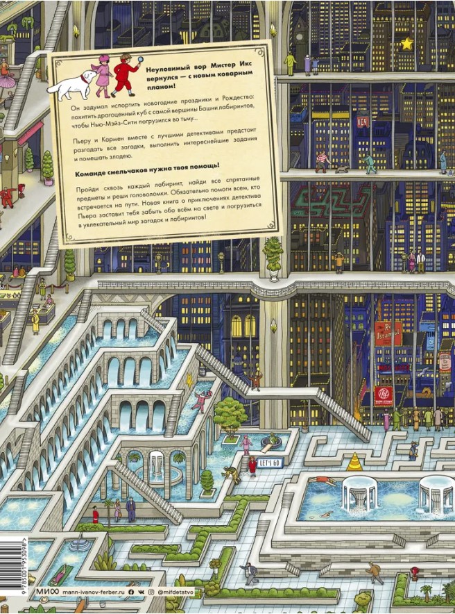 Неуловимый вор Мистер Икс вернулся - с новым коварным планом! Он задумал испортить новогодние праздники и Рождество: похитить драгоценный куб с самой вершины Башни лабиринтов, чтобы Нью-Мэйз-Сити погрузился во тьму... Пьеру и Кармен вместе с лучшими детективами предстоит разгадать все загадки, выполнить интереснейшие задания и помешать злодею. Команде смельчаков нужна твоя помощь! Пройди сквозь каждый лабиринт, найди все спрятанные предметы и реши головоломки. Обязательно помоги всем, кто встречается на пути. Новая книга о приключениях детектива Пьера заставит тебя забыть обо всём на свете и погрузиться в увлекательный мир загадок и лабиринтов!| Издательство | Манн, Иванов и Фербер |