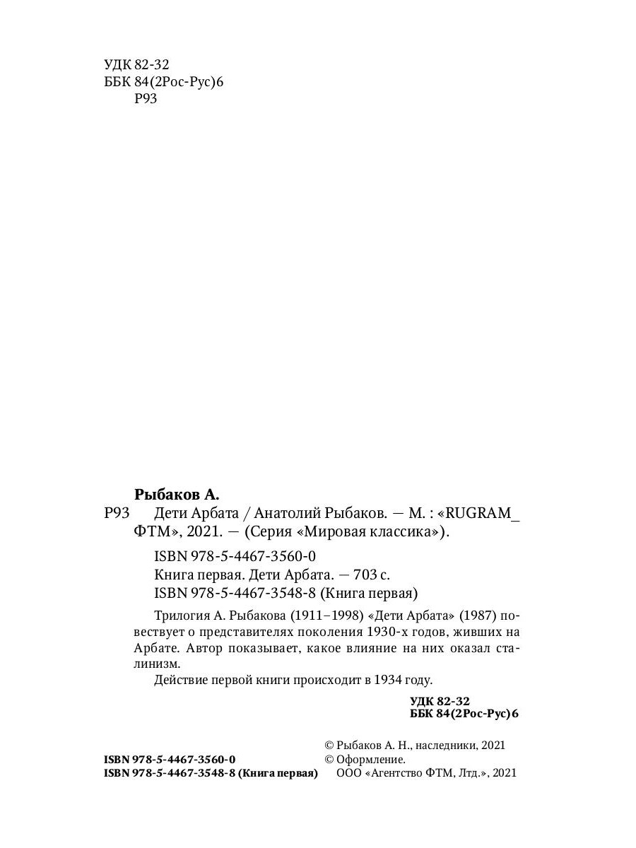 Трилогия А. Рыбакова (1911-1998) «Дети Арбата» (1987) повествует о представителях поколения 1930-х годов, живших на Арбате. Автор показывает, какое влияние на них оказал сталинизм. Действие первой книги происходит в 1934 году.| Издательство | Т8 RUGRAM |