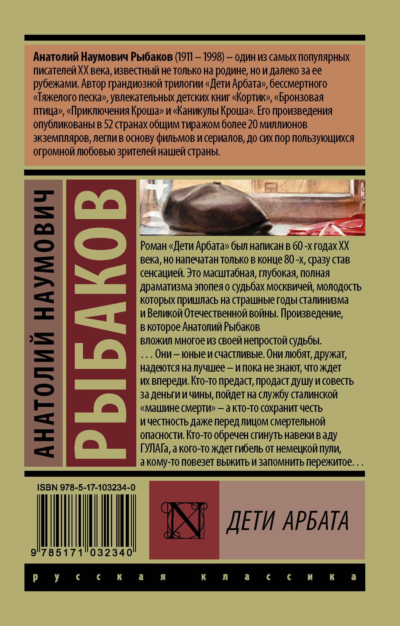 «Дети Арбата» - знаменитая трилогия Анатолия Рыбакова. В нее входят «Дети Арбата» (события происходят в 1933-1934 гг.), «Страх» (о времени с 1935-1937 гг.), и, наконец, заключительная часть «Прах и пепел», описывающая период с 1937 по 1943 гг. Роман «Дети Арбата», написанный в конце 60-х годов, впервые вышел 30 лет назад в 1987 году, читатели были ошарашены. Эффект от его публикации можно сравнить с такими масштабными политическими событиями, как возвращение Сахарова из ссылки. Не случайно президент США Рональд Рейган рукоплескал Горбачеву именно потому, что вернули Сахарова и напечатали «Доктор Живаго» и «Дети Арбата». «Дети Арбата» - это роман о поколении 30-х годов, к которому принадлежал и сам писатель, в каком-то смысле роман-исповедь (в числе действующих лиц есть персонаж, напоминающий нам самого Рыбакова). Герои романа родились и выросли на Арбате. Коренные москвичи. Что их связывает? Молодость, дружба, любовь, надежды на будущее. Что их ждет? Страшные политические репрессии. Разочарования. Разлуки. Горе. Голод, нищета. Даже короткие периоды благополучия как будто омрачены грядущей катастрофой. Кто-то из героев будет отправлен в ссылку, кто-то вступит в ряды органов НКВД, кому-то суждено погибнуть на фронтах Второй Мировой. Как признавался Рыбаков в одном из своих интервью после выхода третьей части романа «Прах и пепел»: «…Это реквием моему поколению… Эти молодые ребята превратились в лагерную пыль в 30-х или погибли в 40-х на фронтах Отечественной войны. Мое поколение истреблено. Безымянные могилы моих сверстников разбросаны от Колымы до Берлина. С ними ушли в небытие их надежды и стремления». «Дети Арбата» - не только роман о молодых, чьи судьбы были сломаны страшной советской машиной, это еще и роман о самой этой машине и людях, управляющих ею. По книге «Дети Арбата» был снят сериал в 2004 году, в главных ролях - звезды российского кино: Чулпан Хаматова, Евгений Цыганов, Евгения Симонова, Максим Суханов, Даниил Страхов и многие другие.| Издательство | ИЗДАТЕЛЬСТВО "АСТ" |