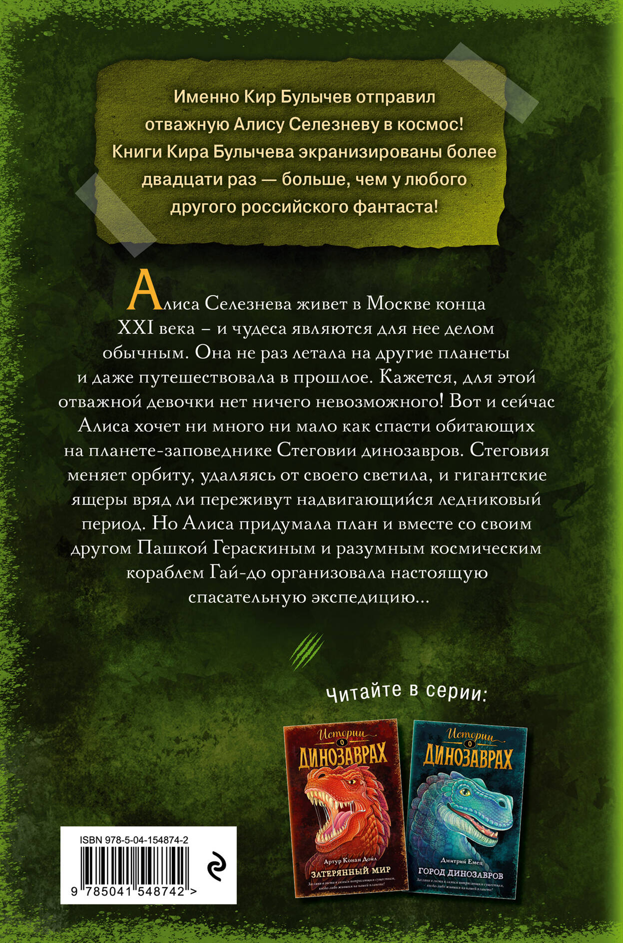 Могли ли вы представить планету-заповедник, населенную динозаврами?! Кир Булычёв - один из самых экранизируемых российских фантастов! XXI век. Москва. Чудеса являются неотъемлемой частью жизни Алисы Селезневой. Она не раз летала на другие планеты и даже путешествовала в прошлое. Кажется, ничего уже не способно её удивить! Но когда планета-заповедник Стеговия меняет свою орбиту, динозавры, живущие на ней, попадают в огромную опасность. Гигантские ящеры вряд ли переживут надвигающийся ледниковый период. Но Алиса уже придумала план! Вместе со своим другом Пашкой Гераскиным и разумным космическим кораблем Гай-до они отправляются в спасательную экспедицию! Иллюстрация на обложке Евгении Кобозевой.| Издательство | ООО "Издательство "Эксмо" |