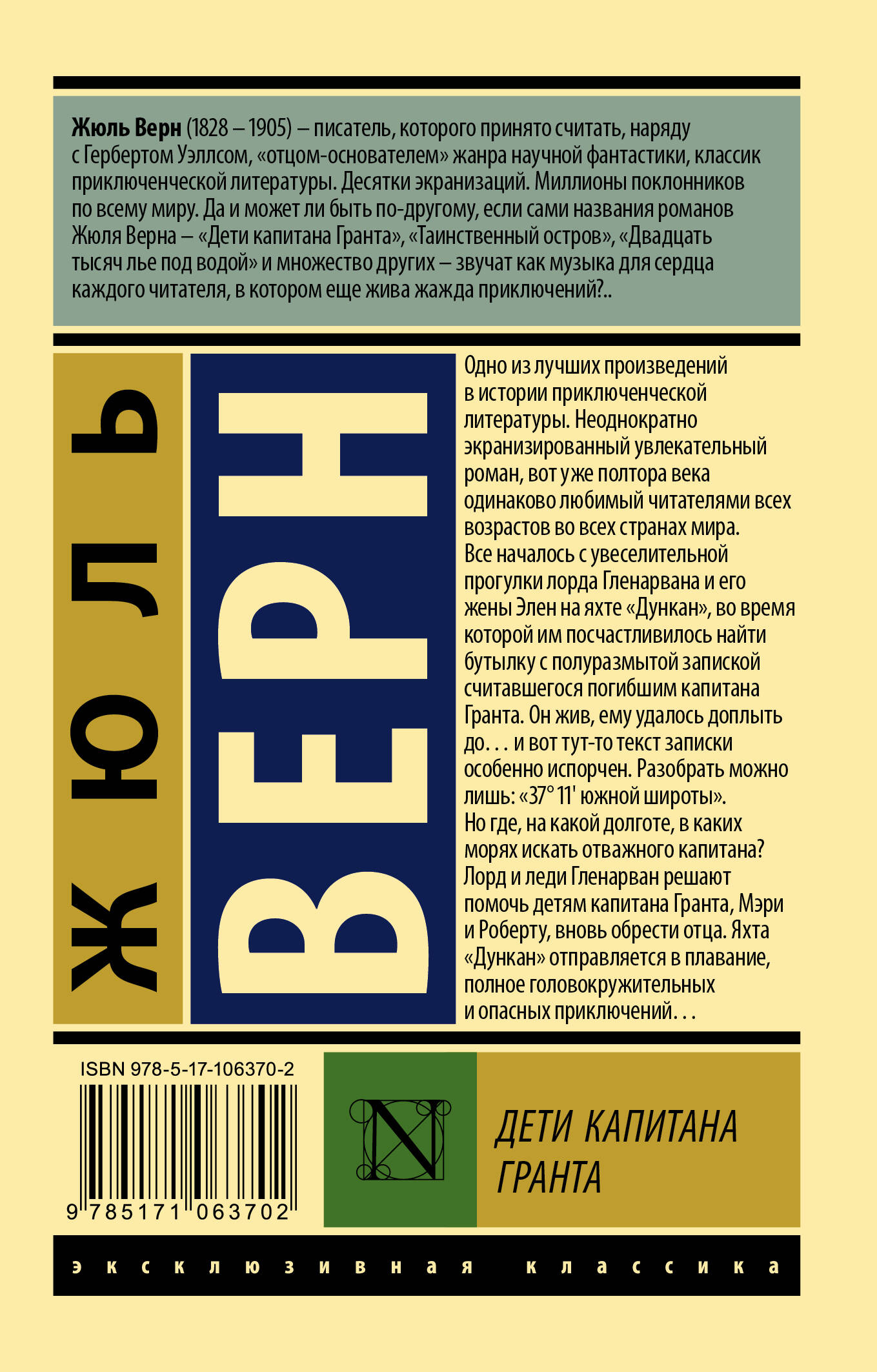 Одно из лучших произведений в истории приключенческой литературы. Неоднократно экранизированный увлекательный роман, вот уже полтора века одинаково любимый читателями всех возрастов во всех странах мира. Все началось с увеселительной прогулки лорда Гленарвана и его жены Элен на яхте "Дункан", во время которой им посчастливилось найти бутылку с полуразмытой запиской считавшегося погибшим капитана Гранта. Он жив, ему удалось доплыть до… и вот тут-то текст записки особенно испорчен. Разобрать можно лишь: "37°11׳ южной широты". Но где, на какой долготе, в каких морях искать отважного капитана? Лорд и леди Гленарван решают помочь детям капитана Гранта, Мери и Роберту, вновь обрести отца. Яхта "Дункан" отправляется в плавание, полное головокружительных и опасных приключений…| Издательство | ИЗДАТЕЛЬСТВО "АСТ" |