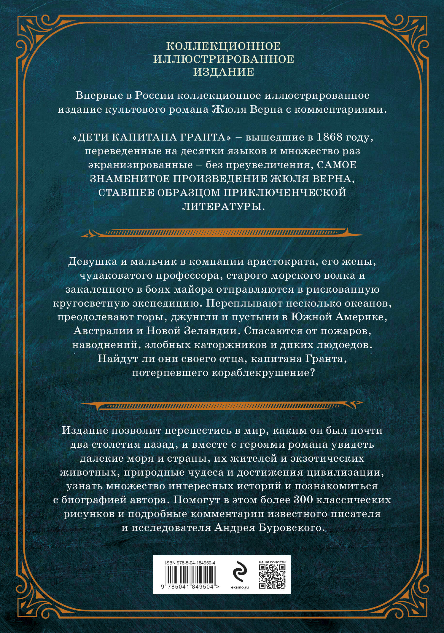 Впервые в России коллекционное иллюстрированное издание культового романа Жюля Верна с комментариями. «Дети капитана Гранта», вышедшие в 1868 году, переведенные на десятки языков и множество раз экранизированные, без преувеличения, самое знаменитое произведение Жюля Верна, ставшее образцом приключенческой литературы. Девушка и мальчик в компании аристократа, его жены, чудаковатого профессора, старого морского волка и закаленного в боях майора отправляются в рискованную кругосветную экспедицию. Переплывают несколько океанов, преодолевают горы, джунгли и пустыни в Южной Америке, Австралии и Новой Зеландии. Спасаются от пожаров, наводнений, злобных каторжников и диких людоедов. Найдут ли они своего отца, капитана Гранта, потерпевшего кораблекрушение? Издание позволит перенестись в мир, каким он был почти два столетия назад, и вместе с героями романа увидеть далекие моря и страны, их жителей и экзотических животных, природные чудеса и достижения цивилизации, узнать множество интересных историй и познакомиться с биографией автора. Помогут в этом более 300 классических рисунков и подробные комментарии известного писателя и исследователя Андрея Буровского.| Издательство | ООО "Издательство "Эксмо" |