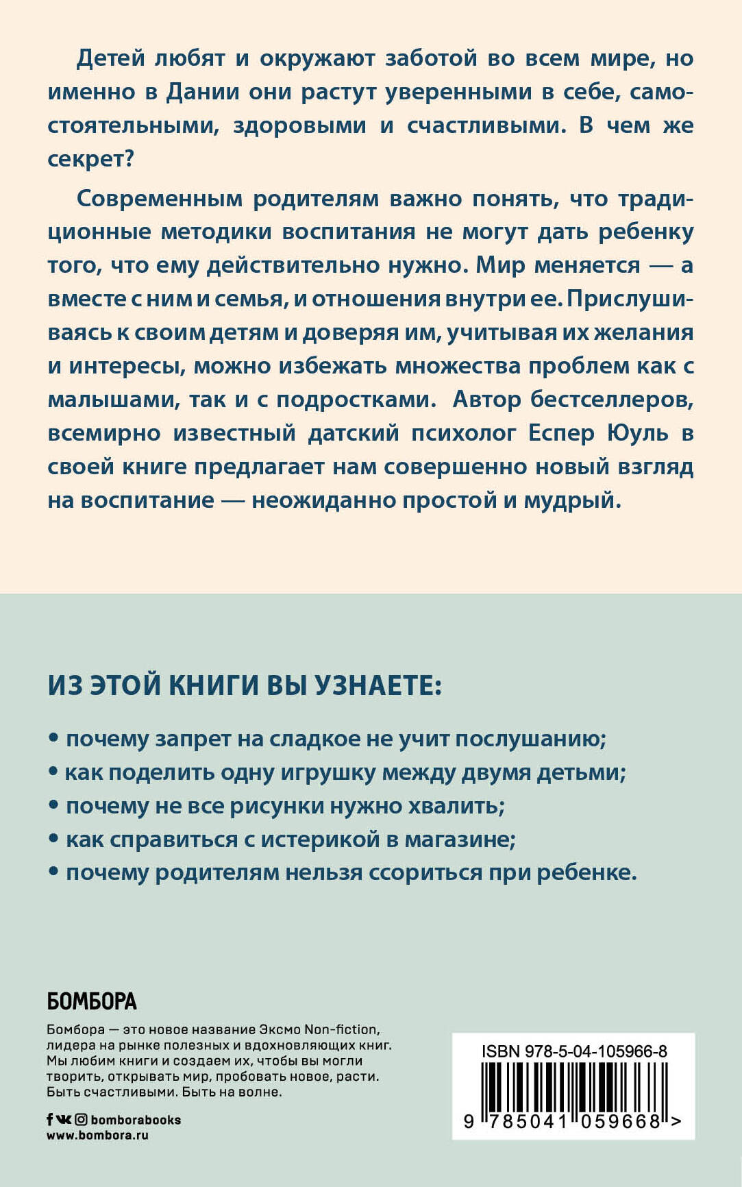 Детей любят и окружают заботой во всем мире, но именно в Дании они растут уверенными в себе, самостоятельными, здоровыми и счастливыми. В чем же секрет? Современным родителям важно понять, что традиционные методики воспитания не могут дать ребенку того, что ему действительно нужно. Мир меняется - а вместе с ним и семья, и отношения внутри нее. Прислушиваясь к своим детям и доверяя им, учитывая их желания и интересы, можно избежать множества проблем как с малышами, так и с подростками. Автор бестселлеров, всемирно известный датский психолог Еспер Юуль в своей книге предлагает нам совершенно новый взгляд на воспитание - неожиданно простой и мудрый. Из этой книги вы узнаете: - Как отношения родителей влияют на младенцев. - Можно ли без слез и ссор приучить детей помогать по дому. - Как наладить отношения с трудным подростком. - Почему взаимное уважение - основа счастливой семьи. - Как правильно повысить самооценку у ребенка.| Издательство | ООО "Издательство "Эксмо" |