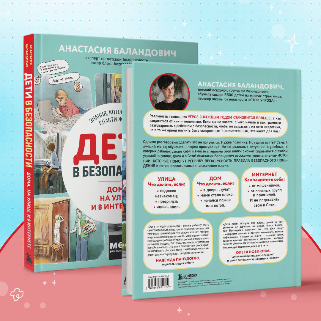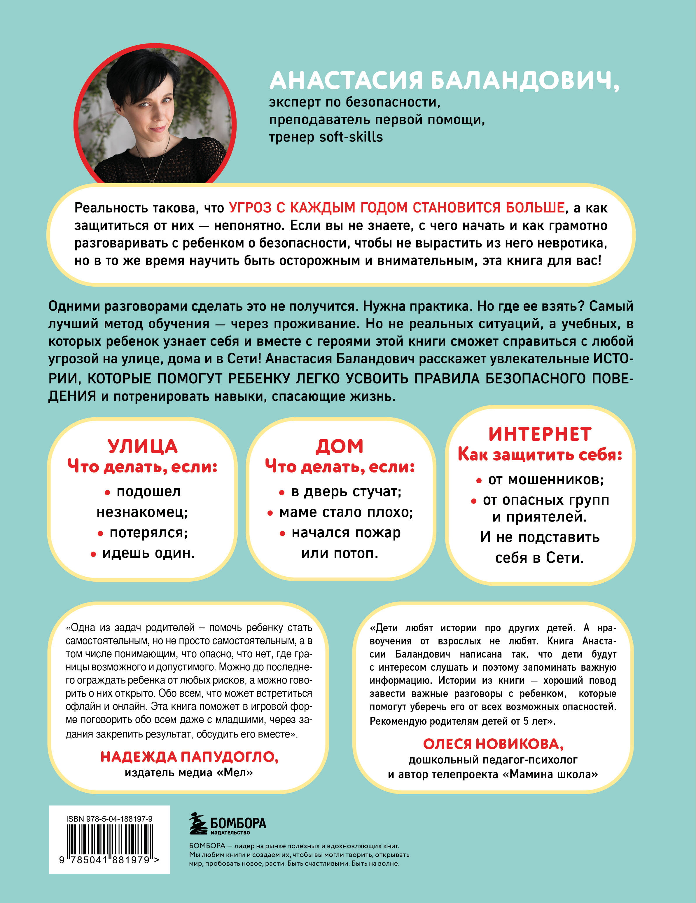 Постоянно обсуждаете с ребенком правила безопасности, но все равно не уверены, что он все понял? А он еще и отмахивается и закатывает глаза со словами: «Мам, я все знаю, сколько можно? Отстань!» Тревожитесь, отпуская его одного, и пытаетесь контролировать каждый его шаг в Сети, из-за чего постоянно ссоритесь? Гиперконтроль и запреты не защитят вашего ребенка, а лишь увеличат пропасть непонимания между вами и повысят вашу и без того высокую тревожность. Вы не можете всегда и везде быть рядом с ним, поэтому лучший способ его защитить - научить распознавать опасность (всегда проще предотвратить, чем разбираться с последствиями) и быстро действовать, чтобы спастись, если ситуация все же произошла! В этой книге тренер по детской безопасности Анастасия Баландович объяснит, как ребенку не попасть в беду на улице, дома и в интернете. Автор на простых примерах-историях разберет основы безопасного поведения. А обсуждение вами этих историй с ребенком поможет сблизиться с ним и развить у него критическое мышление. Автор Анастасия Баландович - эксперт по детской безопасности, детский психолог, педагог дополнительного образования. Обучила свыше 5500 детей из многих стран мира: России, Испании, Великобритании, Германии, Кипра, Белоруссии, ОАЭ, Израиля, Канады, США, Китая, Нидерландов, Казахстана. Провела свыше 1500 онлайн-тренингов и курсов по безопасности детей. Неоднократно выступала в качестве эксперта в федеральных и региональных СМИ, среди которых: «Известия», «Российская газета», РИА Новости, Вести FM, «Первый канал», «Россия 1», «Аргументы и факты», «Невские новости», ТСВ.