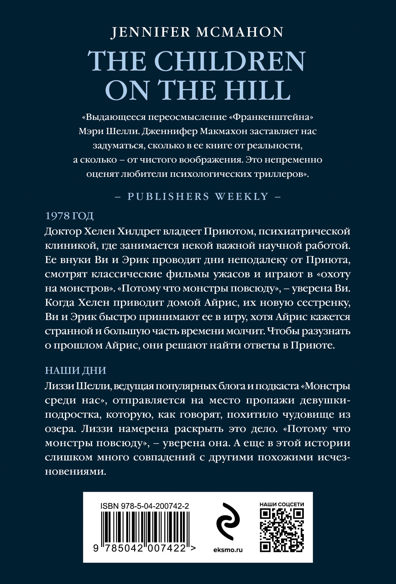 Что снится чудовищу? Какие у него страхи? Быть может, ему снится жертва? Или, возможно, раз за разом к чудовищу во сне приходит охотник? *** 1978 год Доктор Хелен Хилдрет владеет Приютом - психиатрической клиникой, где занимается некой важной научной работой. Ее внуки Ви и Эрик проводят дни неподалеку от Приюта, смотря классические фильмы ужасов и играя в «охоту на монстров». «Потому что монстры повсюду», - уверена Ви. Когда Хелен приводит домой Айрис - их новую сестренку, Ви и Эрик быстро принимают ее в игру, хотя Айрис кажется странной и большую часть времени молчит. Чтобы разузнать о прошлом Айрис, они решают найти ответы в Приюте. Наши дни Лиззи Шелли, ведущая популярных блога и подкаста «Монстры среди нас», отправляется на место пропажи девушки-подростка. Говорят, ее забрало чудовище из озера. Лиззи намерена раскрыть это дело. «Потому что монстры повсюду», - уверена она. А еще в этой истории слишком много совпадений с другими похожими исчезновениями. «Выдающееся переосмысление "Франкенштейна" Мэри Шелли. Дженнифер Макмахон заставляет нас задуматься, сколько в ее книге от реальности, а сколько - от чистого воображения. Это непременно оценят любители психологических триллеров». - Publishers Weekly