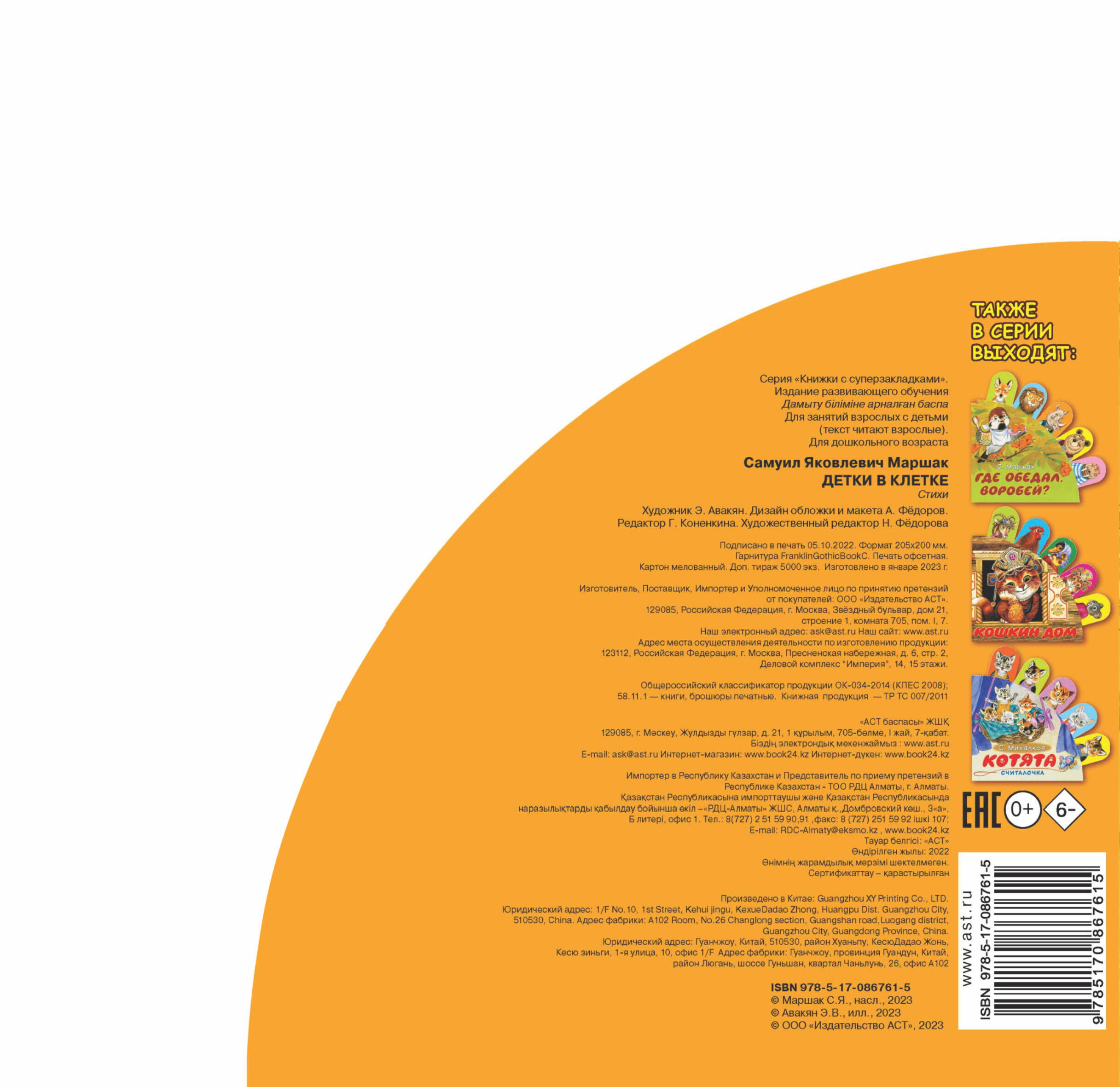 Наша книжка-игрушка с классическими стихами С. Маршака из цикла «Детки в клетке». Ребята познакомятся со зверятами, живущими в зоопарке, и на закладках книги увидят их портреты. Закладки помогут ребятам быстро найти любое стихотворение в книге. Стихи и игра в одной книжке! Для дошкольного возраста.| Издательство | Издательство "АСТ" |