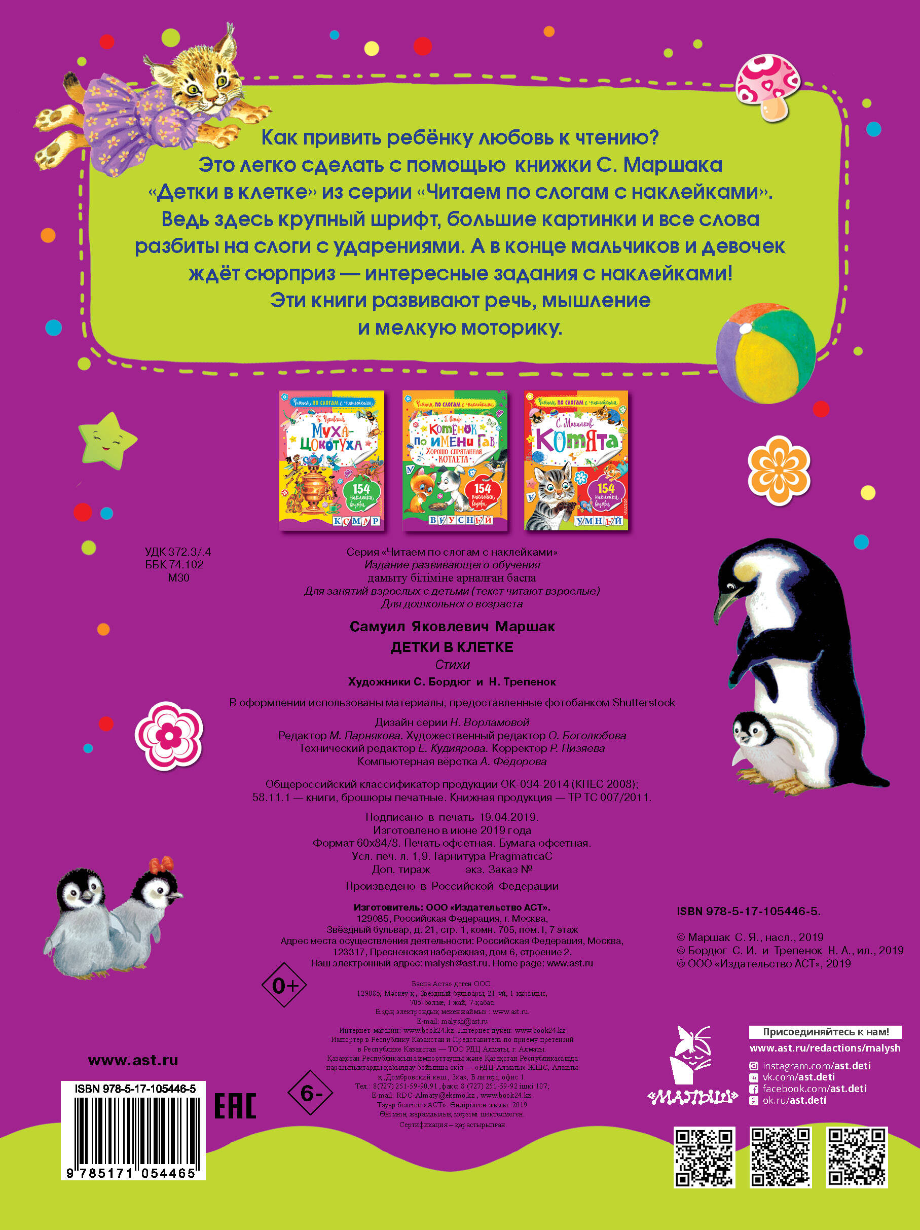 Как привить ребенку любовь к чтению? Это легко сделать с помощью книжки С. Маршака «Детки в клетке» из серии «Читаем по слогам с наклейками». Ведь здесь крупный шрифт, большие картинки и все слова разбит на слоги с ударениями. А в конце мальчиков и девочек ждет сюрприз - интересные задания с наклейками! Эти книги развивают речь, мышление и мелкую моторику.| Издательство | Издательство "АСТ" |