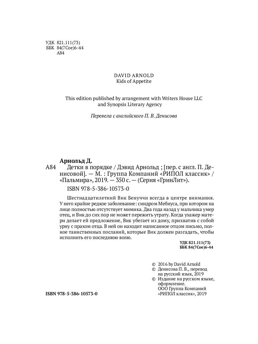 Шестнадцатилетний Вик Бенуччи всегда в центре внимания. У него крайне редкое заболевание: синдром Мебиуса, при котором на лице полностью отсутствует мимика. Два года назад у мальчика умер отец, и Вик до сих пор не может пережить утрату. Когда ухажер матери делает ей предложение, Вик убегает из дому, прихватив с собой урну с прахом отца. В ней он находит написанное отцом письмо, полное таинственных посланий, которые Вик должен разгадать, чтобы исполнить его последнюю волю.| Издательство | РИПОЛ Классик + |
