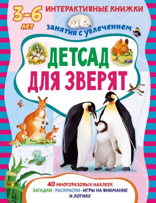 В книге "Детсад для зверят" 40 многоразовых наклеек и более 50 заданий, направленных на получение базовых знаний по теме.
