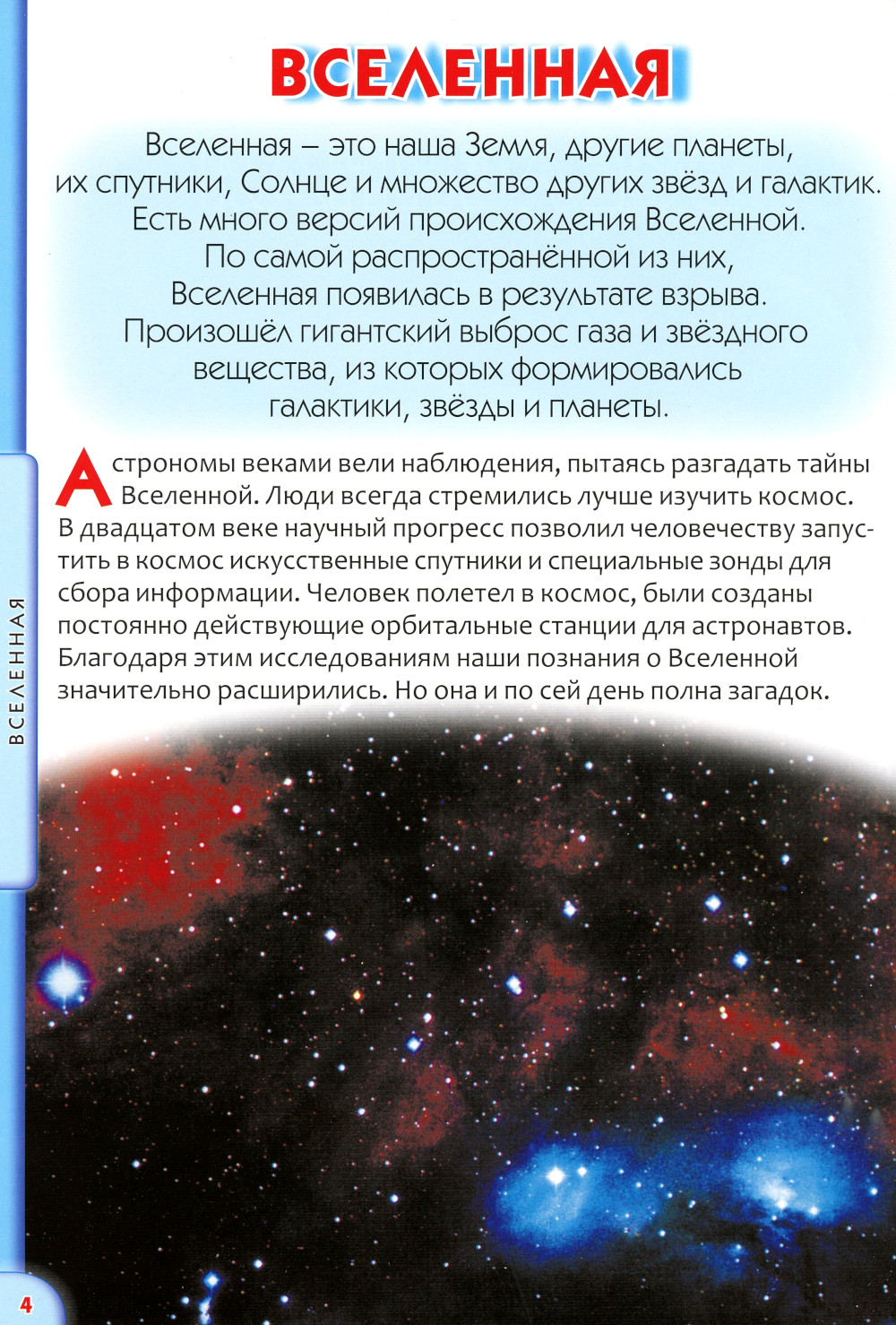У настоящего почемучки всегда наготове сотни каверзных вопросов. И, конечно, ответы на них он хочет получить сейчас же. Если тебе интересно всё, что происходит в удивительном мире вокруг тебя, не теряй ни минуты! Скорей открывай эту книгу, и ты узнаешь, как устроена наша Галактика, когда появилась планета Земля, почему у деревьев листья зелёного цвета, какие животные обитают на суше, в воде и воздухе. Ты познакомишься с величайшими достижениями человечества и увидишь, как устроено человеческое тело - уникальное творение природы. Вперёд, к новым знаниям и открытиям!