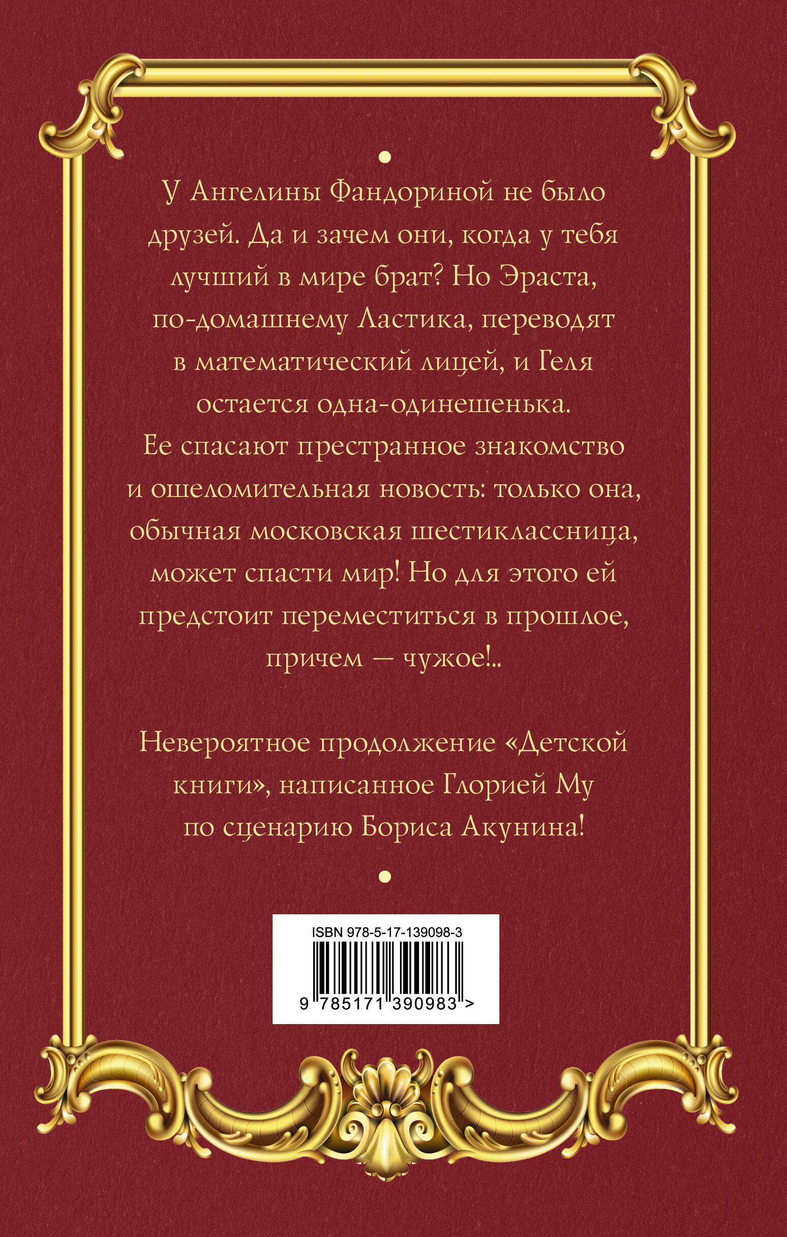 У Ангелины Фандориной не было друзей. Да и зачем они, когда у тебя лучший в мире брат? Но Эраста, по-домашнему Ластика, переводят в математический лицей, и Геля остается одна-одинешенька. Ее спасают престранное знакомство и ошеломительная новость: только она, обычная московская шестиклассница, может спасти мир! Но для этого ей предстоит переместиться в прошлое, причем - чужое!.. Невероятное продолжение "Детской книги", написанное Глорией Му по сценарию Бориса Акунина!| Издательство | АСТ |