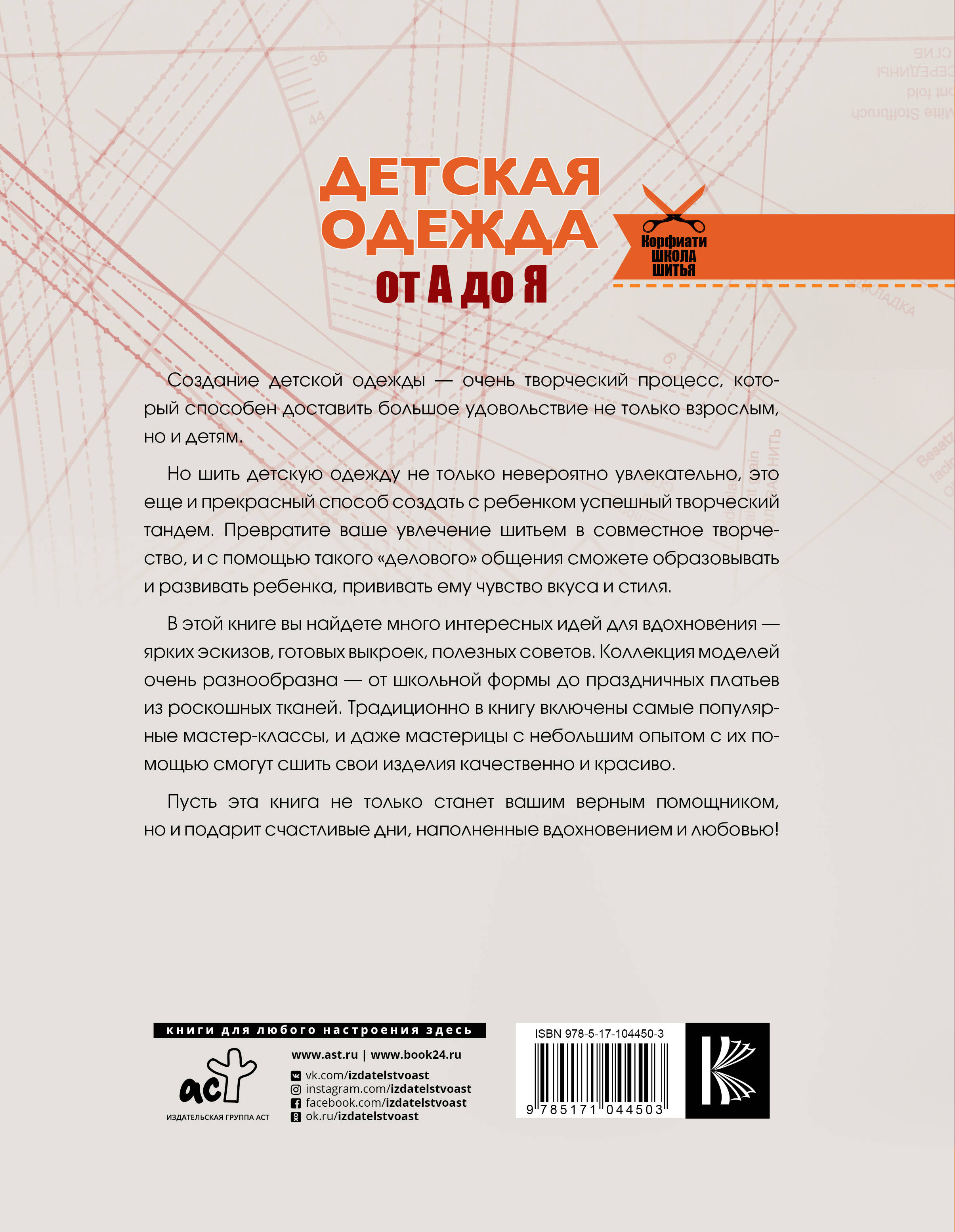 Книга "Детская одежда и аксессуары от А до Я" является одной из жемчужин швейной серии книг Анастасии Корфиати "От А до Я". Каждая мастерица с большой любовью подходит к пошиву одежды для детей, ведь кто как ни наши дети способны оценить ту заботу и усилия, которые прикладывает мама или бабушка, когда шьет наряды любимому человечку. В этой книге вы найдете много интересных идей для вдохновения - ярких эскизов, готовых выкроек, полезных советов. Коллекция моделей очень разнообразна - от школьной формы до праздничных платьев из роскошных тканей. Традиционно, в книгу включены самые популярные мастер-классы, и даже мастерицы с небольшим опытом с их помощью смогут сшить свои изделия качественно и красиво. Пусть эта книга станет не только вашим верным помощником, но и подарит вам счастливые дни, наполненные вдохновением и любовью!| Издательство | Издательство "АСТ" |