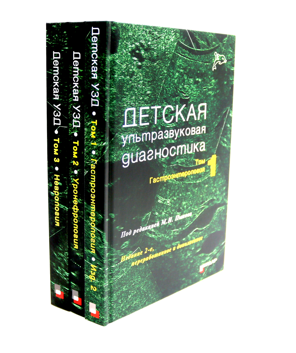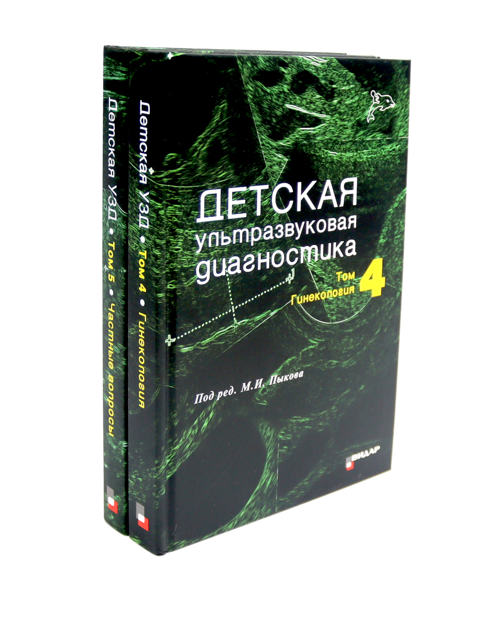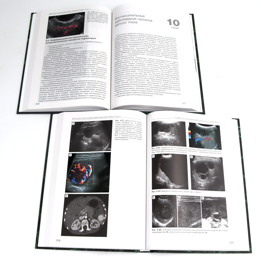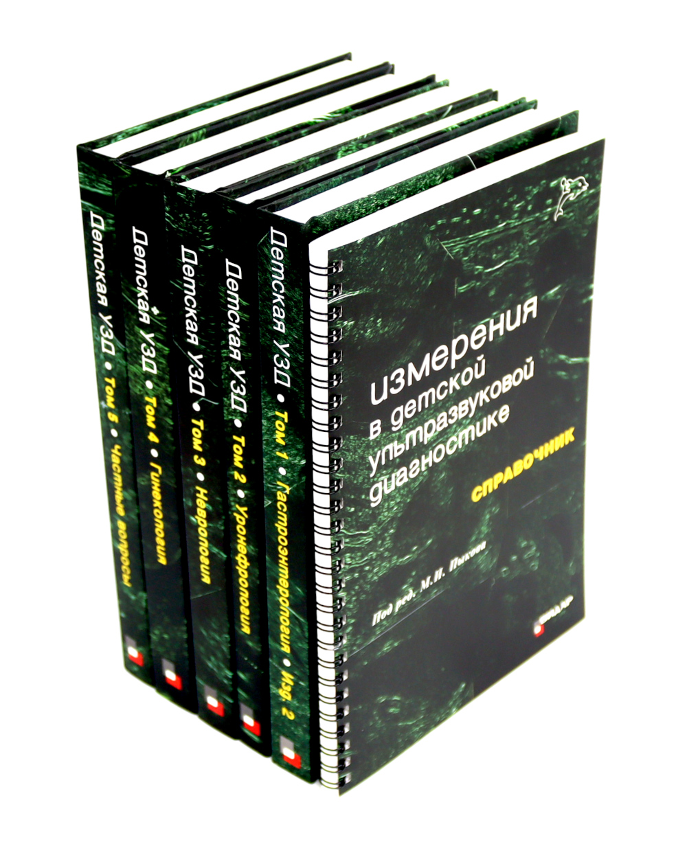 Комплект содержит книги. «Измерения в детской ультразвуковой диагностике» Предлагаемый справочник является приложением к пятитомному учебнику по детской ультразвуковой диагностике. В нем собраны практически все методики исследования внутренних органов ребенка с большим иллюстративным материалом, таблицами, схемами. Для удобства пользования представленный материал по своему строению напоминает основной учебник, где в том же порядке располагаются данные по гастроэнтерологии, уронефрологии, центральной нервной системе, детской гинекологии, эндокринологии и некоторым частным вопросам. В основном приводятся нормативные показатели измерения тех или иных структур. Для лучшего понимания материала иногда приводятся примеры патологических изменений. Впервые приводятся данные по некоторым вопросам, которые не затрагивались в учебнике, - вилочковая железа, крупные сосуды живота, неотложная медицина. «Детская ультразвуковая диагностика. Том 1» Первый том учебника посвящен детской гастроэнтерологии. Подробно рассматриваются возможности эхографии, допплеровских технологий в оценке печени, желчного пузыря, желчных протоков, поджелудочной железы, желудка с брюшным сегментом пищевода, толстой кишки, при остром абдоминальном синдроме. Большое внимание уделяется вопросам неотложной неонатальной хирургии. «Детская ультразвуковая диагностика. Том 2» Книга посвящена одному из самых сложных разделов педиатрии и детской хирургии диагностике патологии мочевыделительной системы у детей. Бурное развитие ультразвуковой диагностической техники, огромный опыт, который накопили сотрудники нашей кафедры, работая в тесном контакте с нефрологами и урологами ведущих детских клиник Москвы, позволил во многом по-новому взглянуть на большинство проблем. В учебнике подробно рассматриваются все существующие методики ультразвукового исследования мочевыделительной системы у детей. На основании тщательного изучения эмбриогенеза, развития почек, мочевого пузыря, мочеточников разработаны высокоинформативные эхографические и допплерографические критерии при врожденных пороках системы, воспалительных изменениях, обструктивных уропатиях, почечной недостаточности (со всеми вытекающими из этого проблемами) и других патологических состояниях. «Детская ультразвуковая диагностика. Том 3» Третий том учебника посвящен одной из самых востребованных тем в детской ультразвуковой диагностике - исследованию центральной нервной системы. В настоящее время невозможно себе представить грамотное ведение ребенка в раннем возрасте без скрининговой нейросонографии, а при неврологической патологии нейросонография используется как основной метод лучевой диагностики. В учебнике подробно представлены различные методики ультразвуковой нейровизуализации, нормальная эхоанатомия, эхографические признаки практически всех патологических изменений центральной нервной системы, которые могут встретиться у маленького пациента. Впервые освещаются вопросы оценки сосудов головы и шеи у детей различных возрастных групп. «Детская ультразвуковая диагностика. Том 4» Четвертый том учебника по ультразвуковой диагностике в педиатрии посвящен детской гинекологии. Во многом он повторяет материалы известной и популярной монографии, которая вышла неско