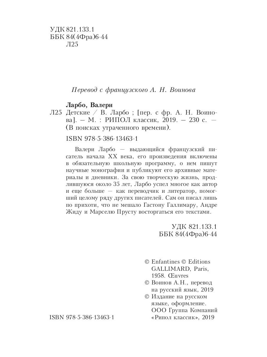 Валери Ларбо - выдающийся французский писатель начала XX века, его произведения включены в обязательную школьную программу, о нем пишут научные монографии и публикуют его архивные материалы и дневники. За свою творческую жизнь, продлившуюся около 35 лет, Ларбо успел многое как автор и еще больше - как переводчик и литератор, помогший целому ряду других писателей. Сам он писал лишь по прихоти, что не мешало Гастону Галлимару, Андре Жиду и Марселю Прусту восторгаться его текстами.| Издательство | Рипол Классик |