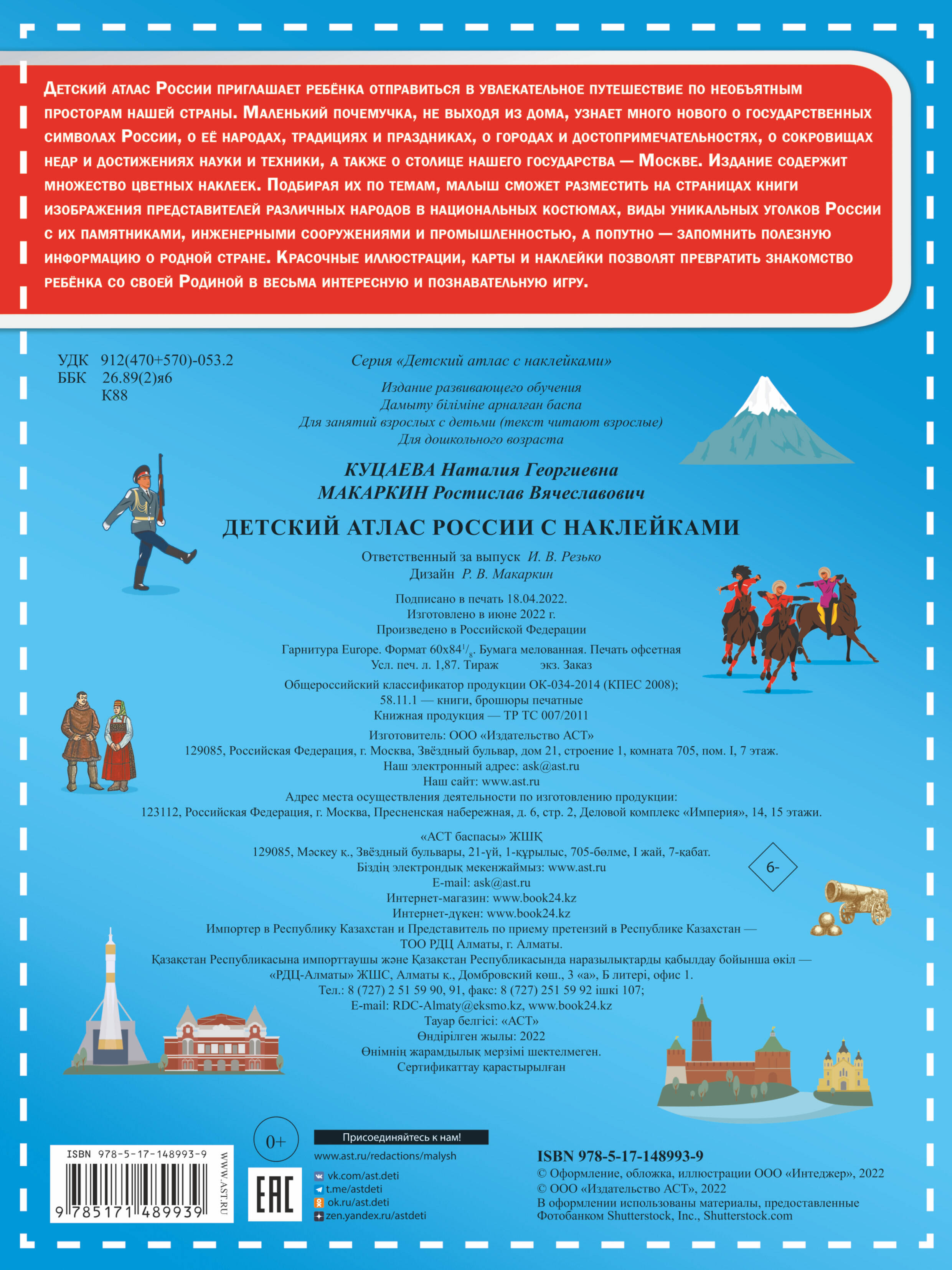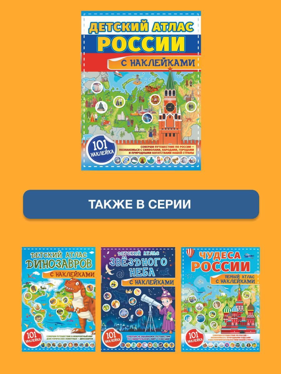 Детский атлас России с наклейками позволит ребенку непринужденно, в процессе игры запомнить важную информацию о нашей Родине, ее государственных символах и народах, федеральных округах и крупнейших городах. Малыш сможет выучить названия и даты главных праздников, познакомиться с основными сооружениями и памятными местами столицы нашего государства Москвы, а также узнать, какими природными богатствами и культурными достопримечательностями славится Россия. 5 причин купить: 1. Из двух предложенных похожих изданий - с наклейками и без - маленький читатель всегда выберет книгу с наклейками, ведь детям доставляет очень большое удовольствие сам процесс подбора наклеек, от этого не откажется ни один ребенок! 2. Занятия с таким изданием побуждают ребенка учиться читать, потому что все, что связано с названием и тематикой наклейки, вызывает особенный интерес у большинства детей. 3. Ребенок будет стремиться задавать вопросы, заинтересовавшись темами атласа, что значительно расширит его кругозор. 4. Занятия с наклейками, по оценке детских психологов, положительно влияют на когнитивное развитие ребенка. В игре с наклейками он совершенствует зрительную память, мелкую моторику, внимание и усидчивость. 5. Малыш может знакомиться с атласом как самостоятельно, так и вместе со взрослыми, что станет прекрасным видом проведения совместного досуга. При этом данное занятие настолько увлекательное и радостное, что малыш его не бросит на полпути.| Издательство | АСТ |