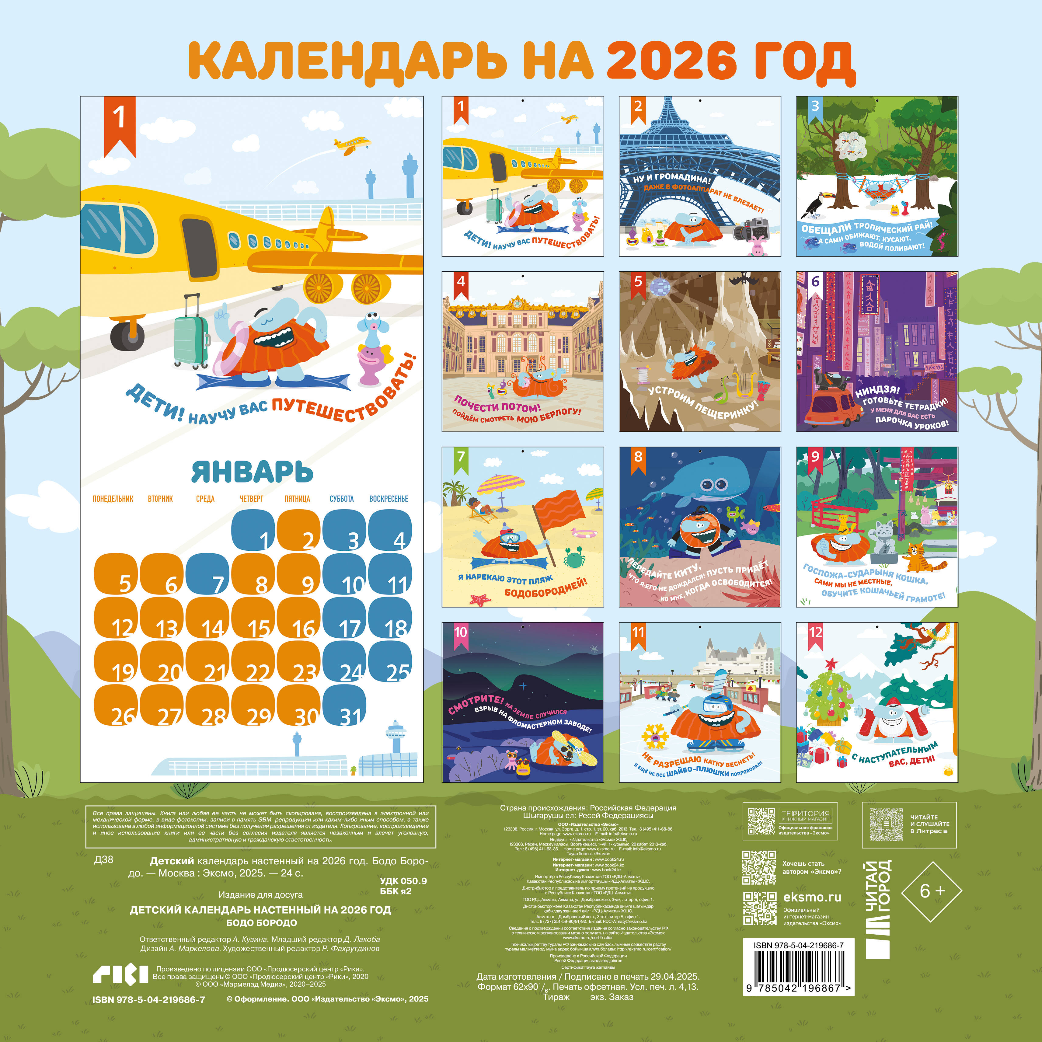 О календаре: «Календарь настенный на 2026 год. Бодо Бородо» - полезный подарок вашему ребенку на Новый год. Вместе с Бодо он запомнит месяцы, дни недели и научится следить за расписанием. Бодо не даст вашему ребенку заскучать - каждый месяц его ждет новое приключение и искрометная цитата от любимого персонажа мультфильма. Названия дней недели в календарной сетке написаны полностью, чтобы ваш ребенок смог быстрее их запомнить. Материалы: Наши детские настенные календари отличаются высоким качеством полиграфии. Календари напечатаны на плотной мелованной матовой бумаге: обложка - бумага мелованная 200 г, блок - бумага мелованная 150 г. Теперь можно не беспокоиться, что первый лист порвется под тяжестью всего календаря. В каждый экземпляр календаря вложен гофрокартон, чтобы тот не помялся при транспортировке. Также календарь целлофанируется в плотный пакет с европодвесом. В календаре есть отверстие диаметром 5 мм для крепления на стене. На каждом листе месяца указано: - название месяца; - государственные праздники и выходные дни; - на последнем развороте есть мини-календарь на 2027 год. Технические параметры: - Размеры календаря в развернутом виде 29х58 см (в упакованном - 29х29 см). - Тип календаря - настенный перекидной. - Год - 2026. - Календарная сетка - с разбивкой по месяцам. - Вид скрепления - скрепка. - Ширина - 29 см. - Высота - 29 см. - Обложка - мелованная бумага 200 г/м2. - Внутренний блок - мелованная бумага 150 г/м2. - Подложка - плотный гофрокартон для поддержания формы. - Индивидуальная упаковка в плотный целлофановый пакет.| Издательство | ООО "Издательство "Эксмо" |