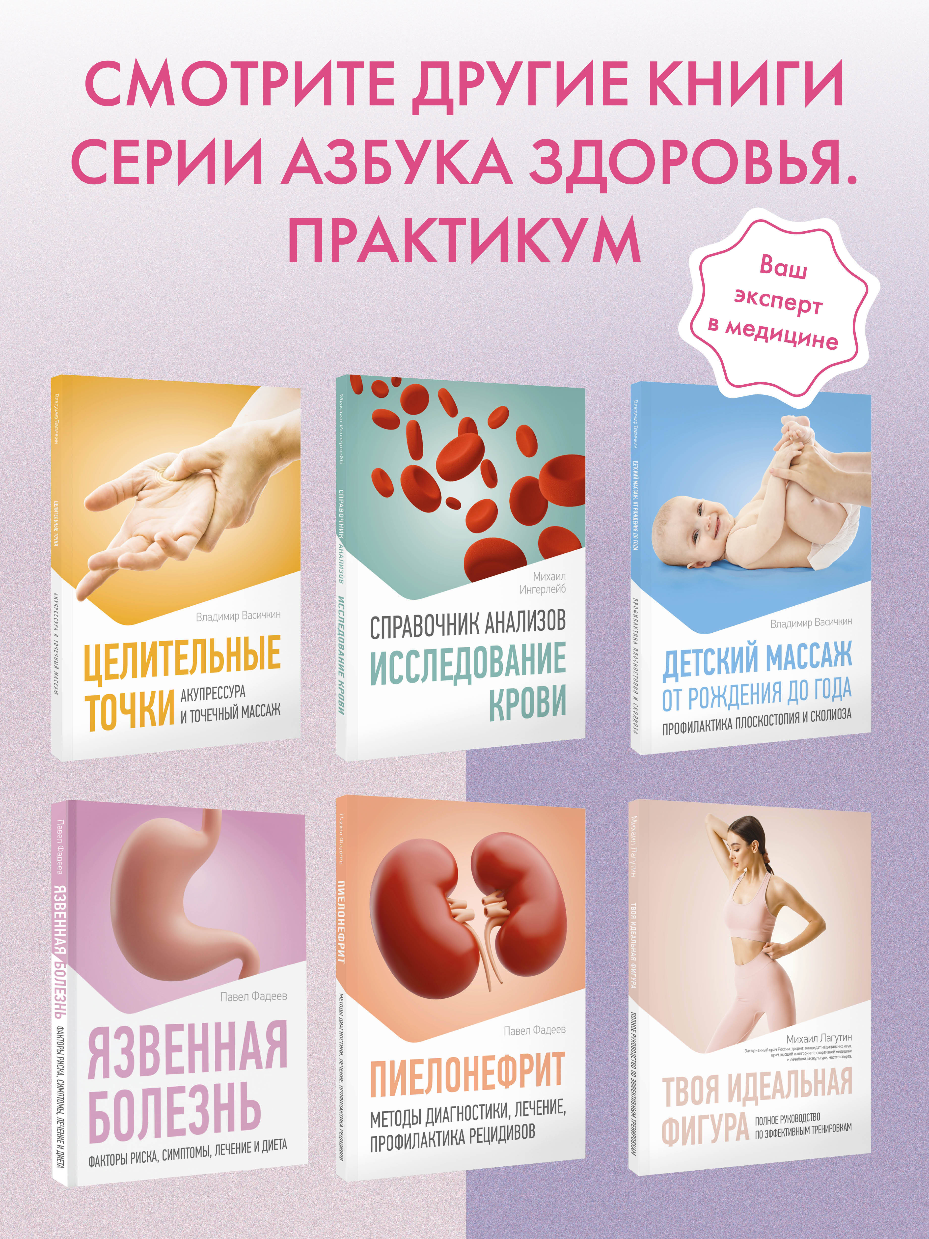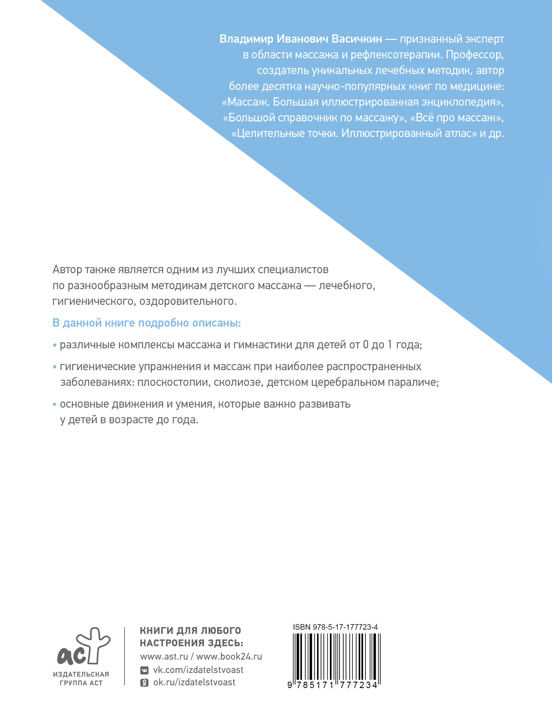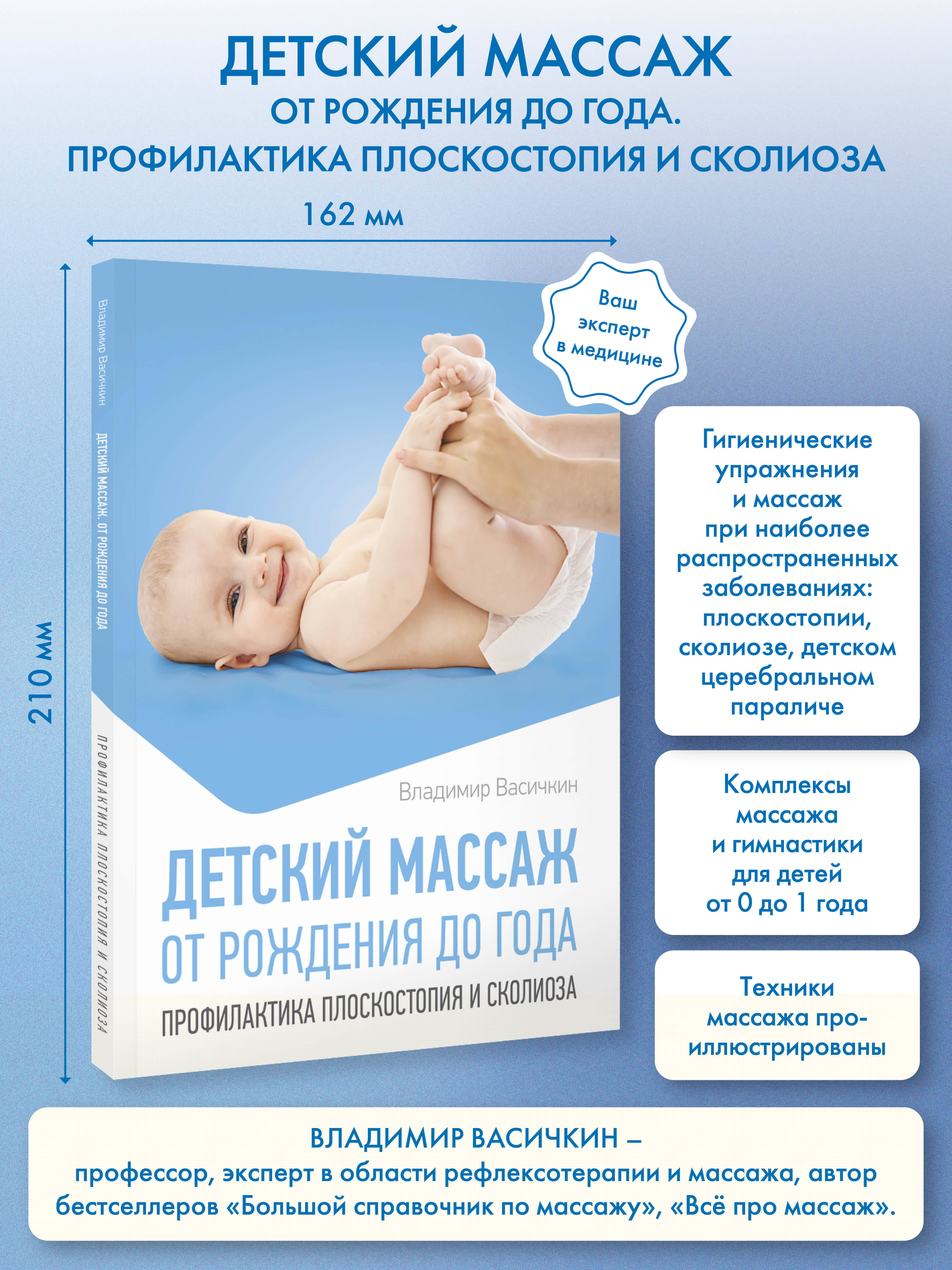 Владимир Иванович Васичкин - признанный эксперт в области массажа и рефлексотерапии. Профессор, создатель уникальных лечебных методик, автор более десятка научно-популярных книг по медицине: "Массаж. Большая иллюстрированная энциклопедия", "Большой справочник по массажу", "Всё про массаж", "Целительные точки. Иллюстрированный атлас". Автор также является одним из лучших специалистов по разнообразным методикам детского массажа - лечебного, гигиенического, оздоровительного. В данной книге подробно описаны: различные комплексы массажа и гимнастики для детей от 0 до 1 года; гигиенические упражнения и массаж при наиболее распространенных заболеваниях: плоскостопие, сколиоз, детский церебральный паралич; основные движения и умения, которые важно развивать у детей в возрасте до года.| Издательство | Издательство "АСТ" |