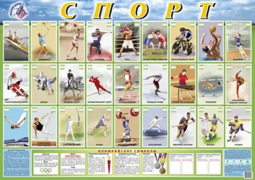Плакат "Спорт". На плакате показаны некоторые олимпийские виды спорта, дана информация об истории и символах Олимпийских Игр. Ребёнок в процессе ознакомления с плакатом, может выполнять задания:рисовать на нём маркером, наклеивать картинки. Благодаря этому он более глубоко познакомится с разными видами спорта.