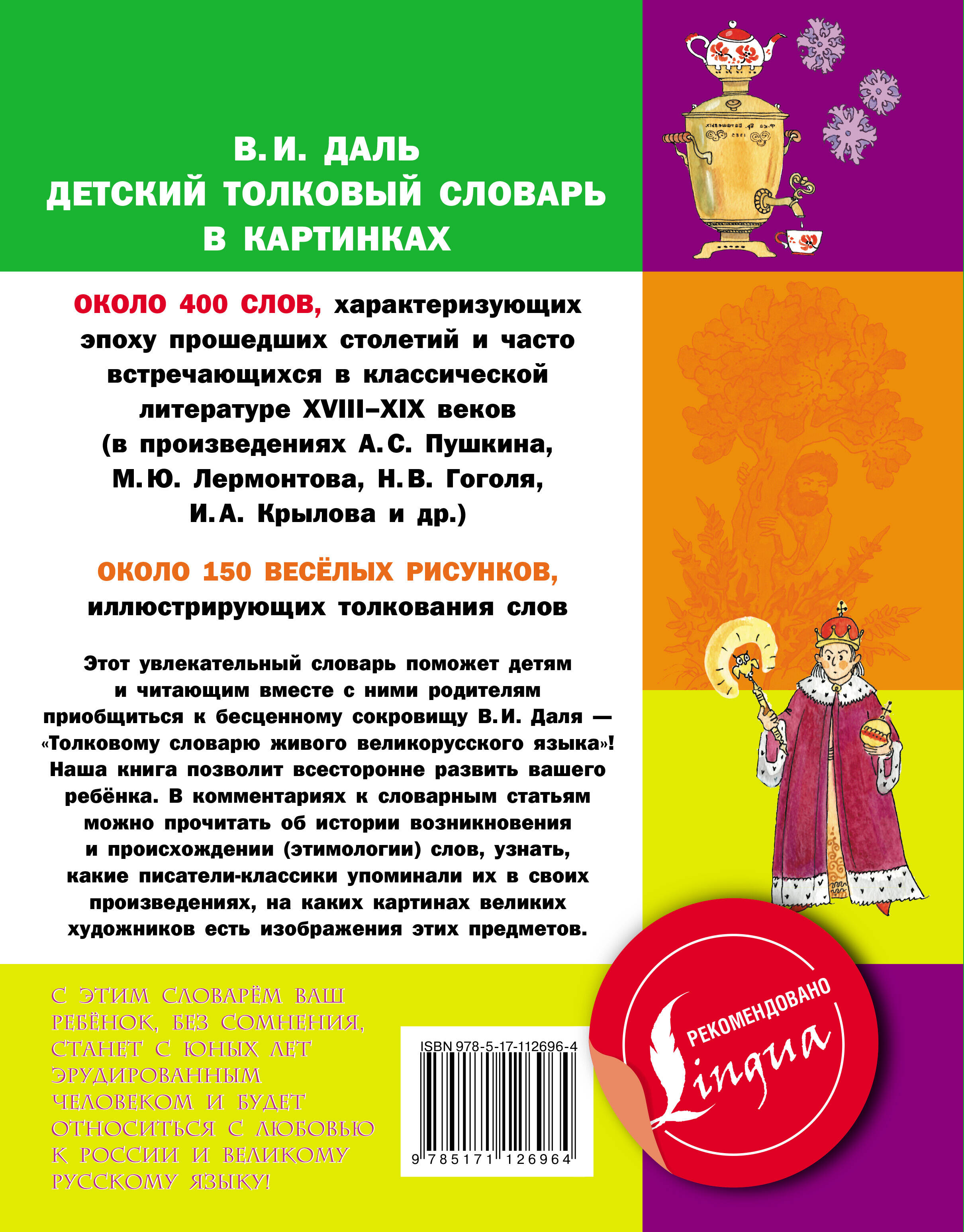Словарь поможет детям приобщиться к бесценному сокровищу В. И. Даля - "Толковому словарю живого великорусского языка". Содержит около 400 слов, характеризующих эпоху прошедших столетий и часто встречающихся в классической литературе XVIII-XIX веков. Оригинальное оформление страниц и около 150 красочных весёлых рисунков дадут возможность детям с удовольствием погрузиться в реалии русской жизни того времени. Словарь адресован школьникам средних классов, а также он будет полезен младшим школьникам, их родителям и всем, кто интересуется историей русского народа и его фольклором.| Издательство | Издательство "АСТ" |