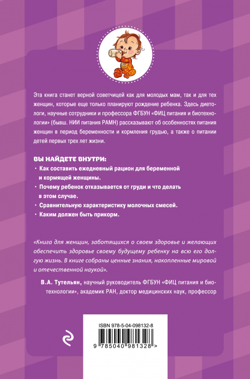 Эта книга станет верной советчицей как для молодых мам, так и для тех женщин, которые еще только планируют рождение ребенка. В этой книге диетологи, научные сотрудники и профессора ФГБУН "ФИЦ питания и биотехнологии" (бывш. НИИ питания РАМН) рассказывают об особенностях питания женщин в период беременности и кормления грудью, а также о питании детей первых трех лет жизни. Вы найдете внутри: Как составить ежедневный рацион для беременной и кормящей женщины. Почему ребенок отказывается от груди и что делать в этом случае. Сравнительная характеристика молочных смесей. Каким должен быть прикорм.| Издательство | Эксмо |