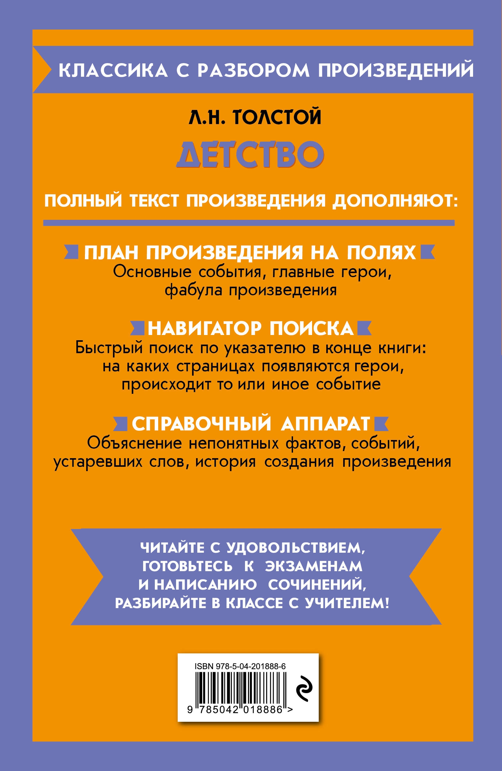 Л. Н. Толстой - величайший писатель в истории русской литературы. Его повесть «Детство» - первая книга автобиографической трилогии, признана на мировом уровне. Этот яркий пример творческого гения писателя до сих пор пользуется большой популярностью как среди школьников, так и среди представителей старшего поколения. Новое издание повести станет незаменимым помощником в подготовке к ЕГЭ, ОГЭ и урокам литературы. В нем вы найдете уникальные справочные материалы: заметки на полях для быстрого поиска нужного фрагмента, развернутые комментарии, где объясняются устаревшие слова и непонятные факты, историю создания произведения, указатель имен и событий. Все это поможет не только быстро и легко подготовиться к экзаменам, но и узнать новые факты, которые можно было упустить на уроке. В произведении рассказывается о жизни и воспитании дворянина Николеньки в середине XIX века, о его переживаниях и увлечениях, неожиданных переменах в жизни и взрослении.| Издательство | ООО "Издательство "Эксмо" |