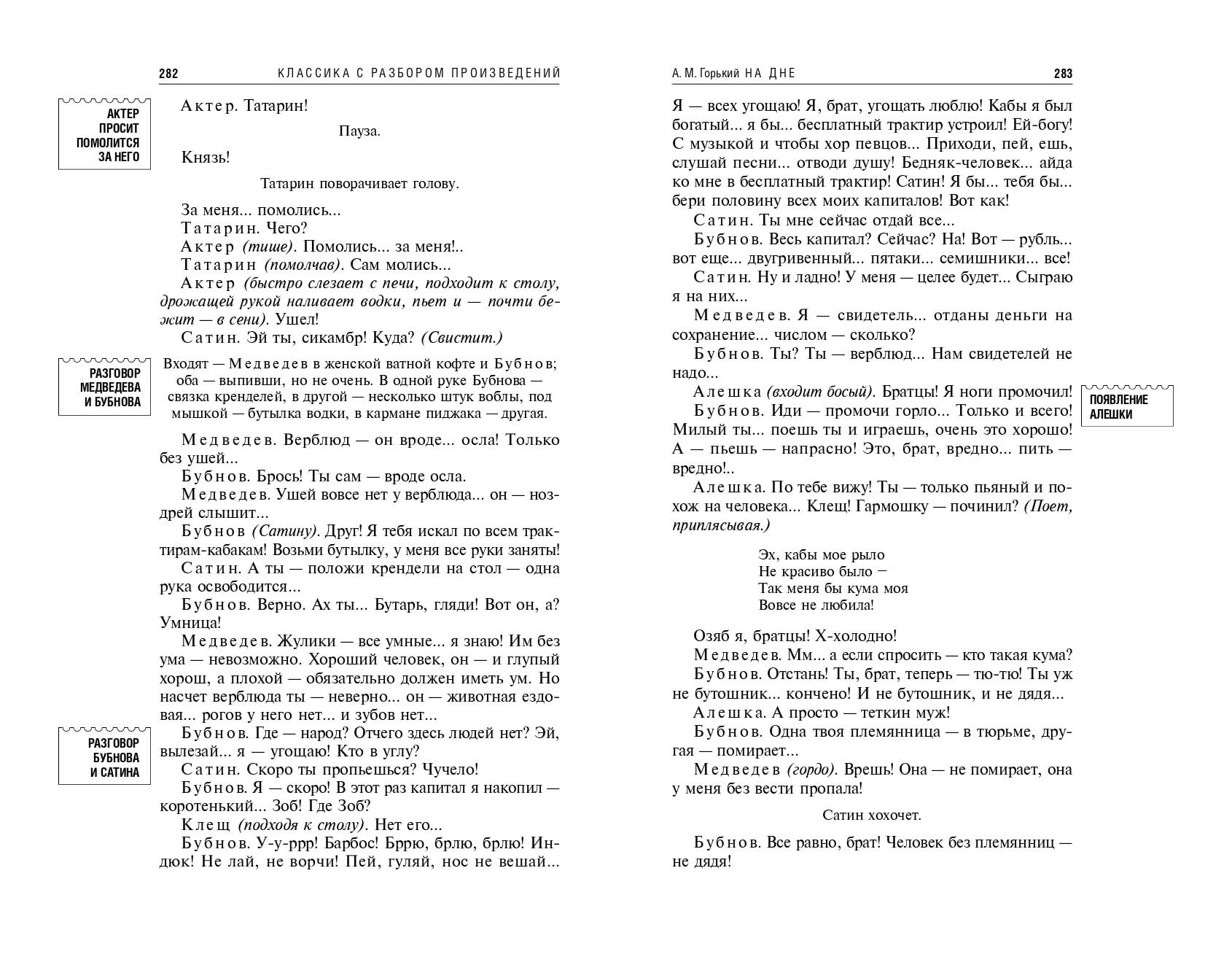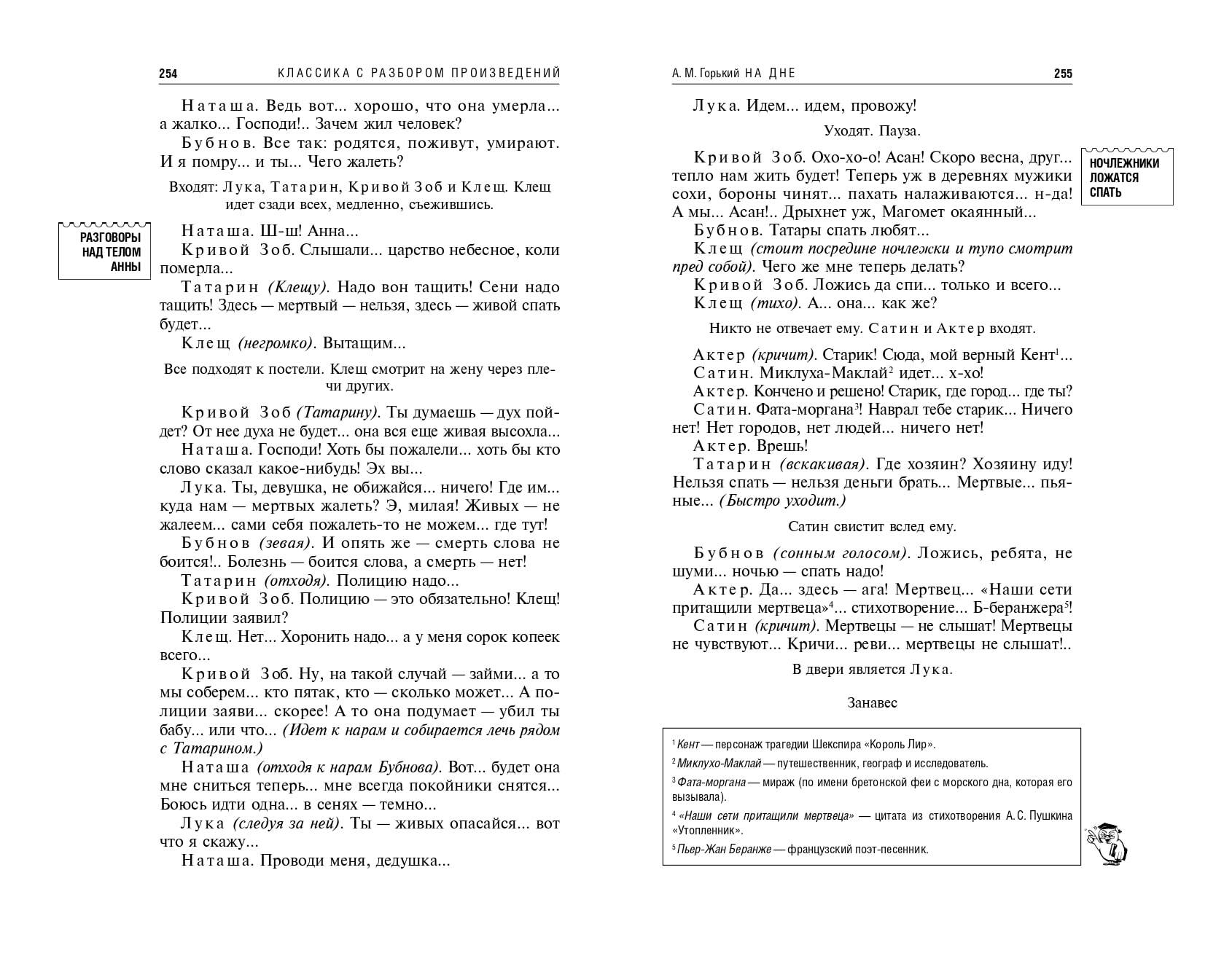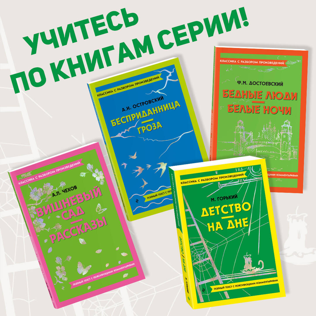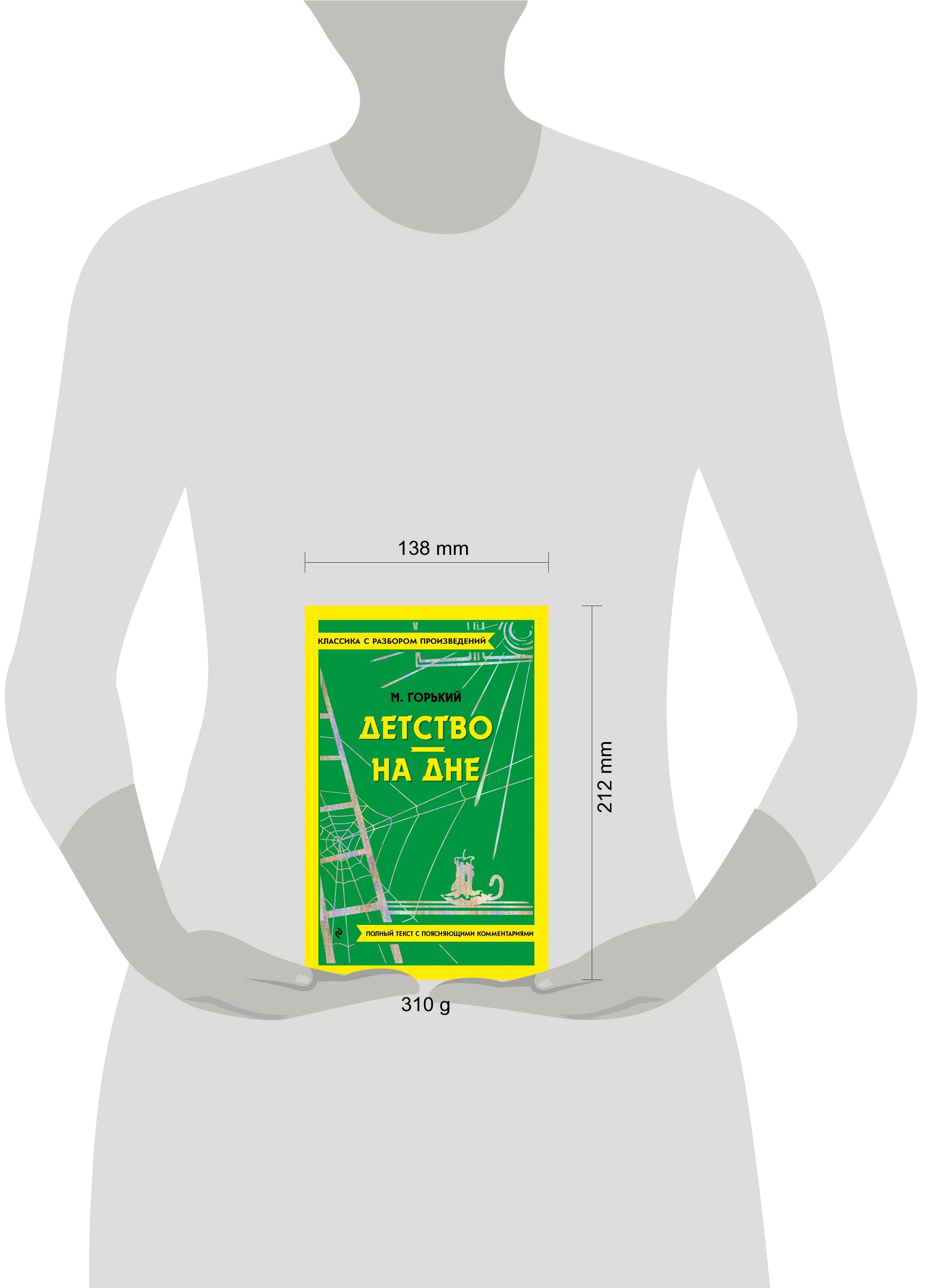 В книгу вошли два легендарных произведения русской литературы, написанные пятикратным номинантом на Нобелевскую премию М. Горьким. Повесть «Детство» и пьеса «На дне» до сих пор пользуются большой популярностью как среди школьников, так и среди представителей старшего поколения. Новое издание этих произведений в невероятном оформлении с голографической фольгой на обложке станет не только незаменимым помощником в подготовке к ЕГЭ, ОГЭ, урокам литературы, но и приятным подарком для всех ценителей классической литературы. В нем вы найдете уникальные справочные материалы: заметки на полях для быстрого поиска нужного фрагмента, развернутые комментарии, где объясняются устаревшие слова и непонятные факты, историю создания произведений, указатель имен и событий. Все это поможет не только быстро и легко подготовиться к экзаменам, но и узнать новые факты, которые можно было упустить на уроке. Повесть «Детство» является автобиографической и рассказывает о жизни и воспитании Алеши Пешкова (настоящее имя автора) в глухой провинции XIX века. Через воспоминания главного героя автор показывает жестокость и лицемерие общества, сохраняя при этом веру в человечность и светлое будущее. Герои социально-философской драмы «На дне» - изгои, «бывшие» люди, влачащие жалкое существование в ночлежке для бедных - делятся своими трагическими жизненными историями. Появление таинственного странника Луки заставляет героев поверить в светлое будущее, привносит веру в лучшее, однако суровая реальность не дает их надеждам осуществиться. Собрание всех книг серии «Классика с разбором произведений» в стильных обложках станет невероятным украшением домашней библиотеки. Ее яркое оформление можно будет заслуженно назвать жемчужиной вашей коллекции.| Издательство | ООО "Издательство "Эксмо" |